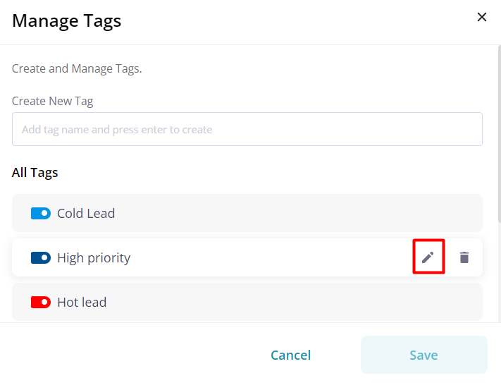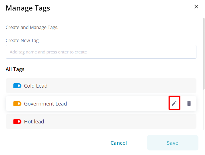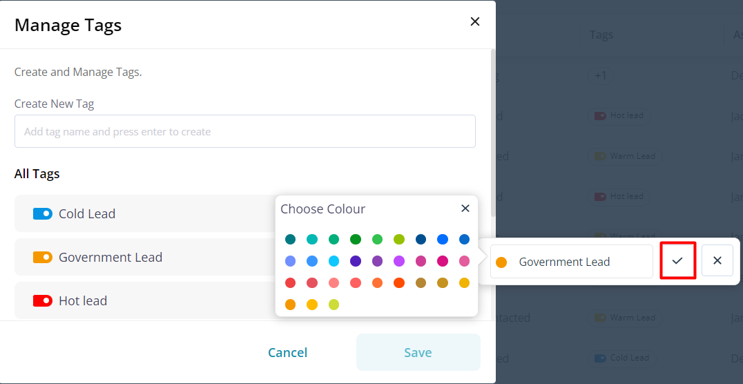 Pepper Cloud CRM empowers you to modify current tags, allowing you to alter their name or colour to suit your requirements.