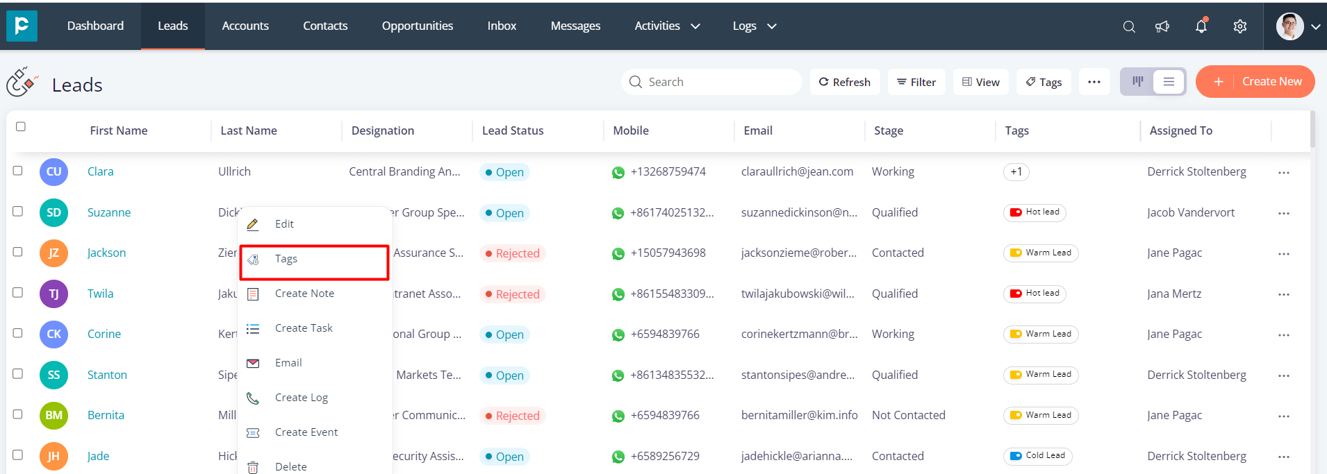 - To edit an existing tag, click on the “Tags” button in any of the business modules(Leads, Contacts, Opportunities, or Accounts).