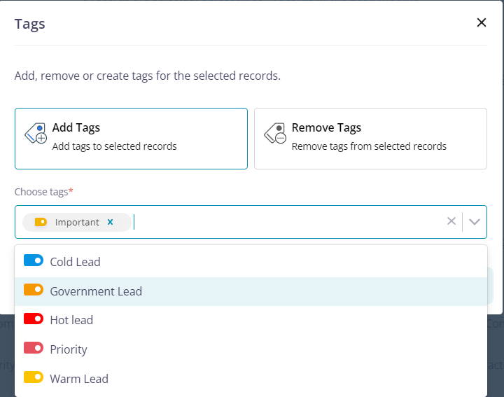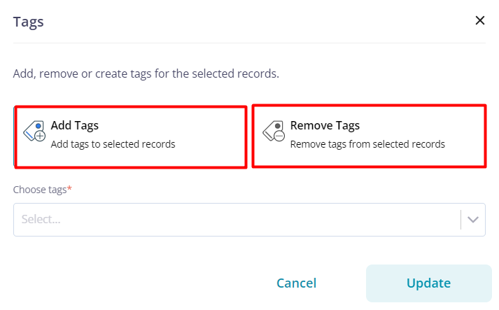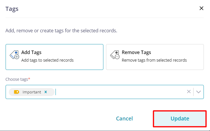 3. Click on “Add Tags” to add tags to the selected records or click on “Remove Tags” to delete tags.