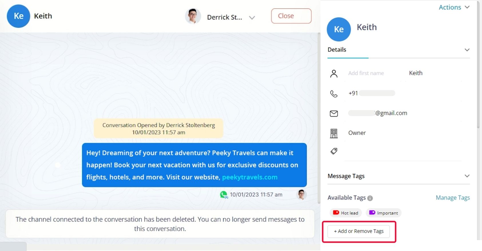 You can also add or delete tags for conversation in the Message Module. Mentioned below are the steps to do so.