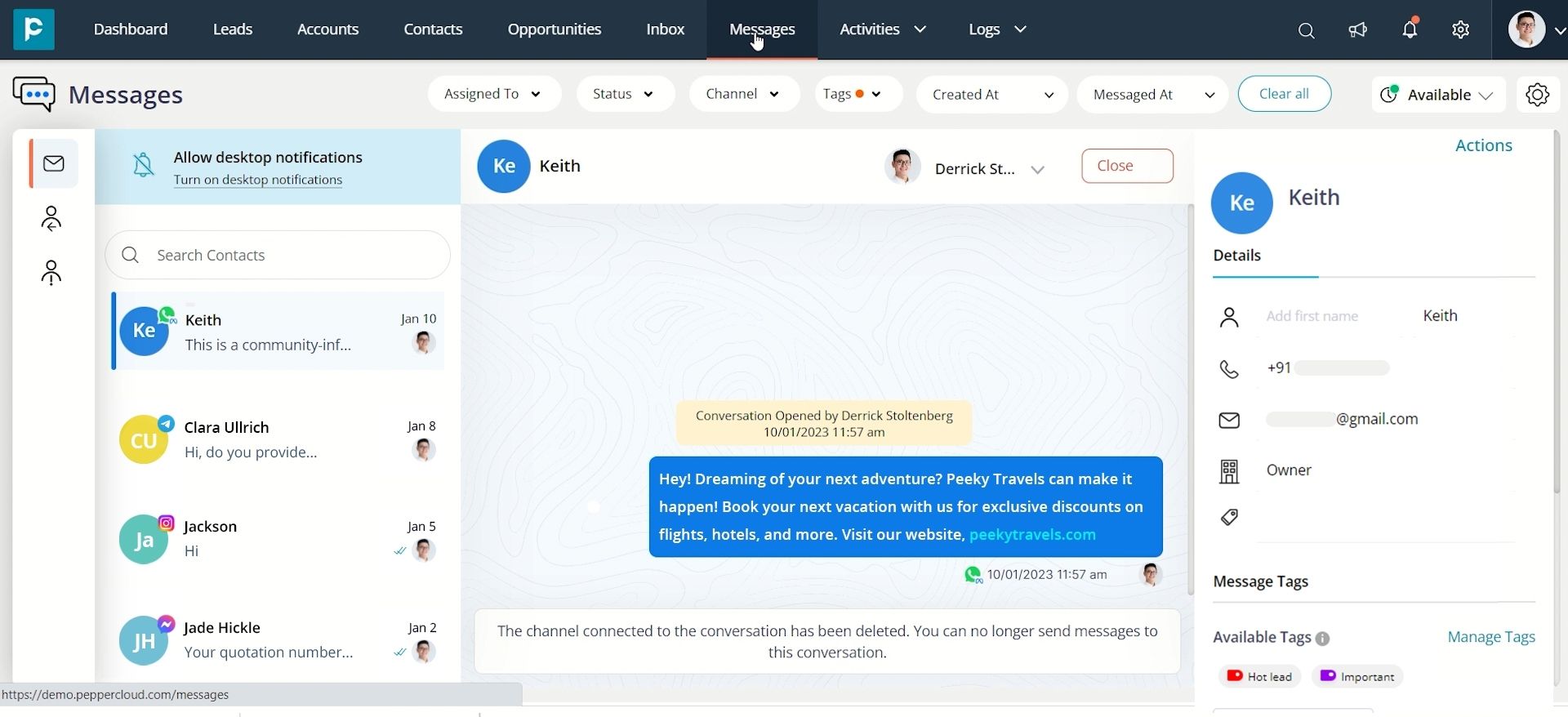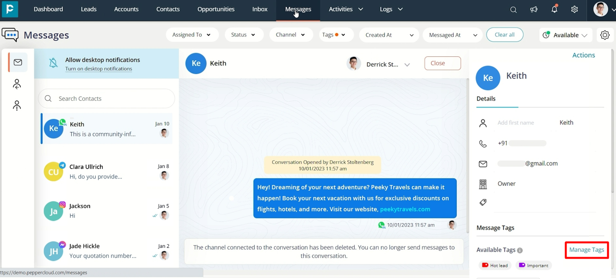 In Pepper Cloud CRM, you can apply tags in both message and business modules, including “Leads”, “Contacts”, “Accounts”, and “Opportunities”.