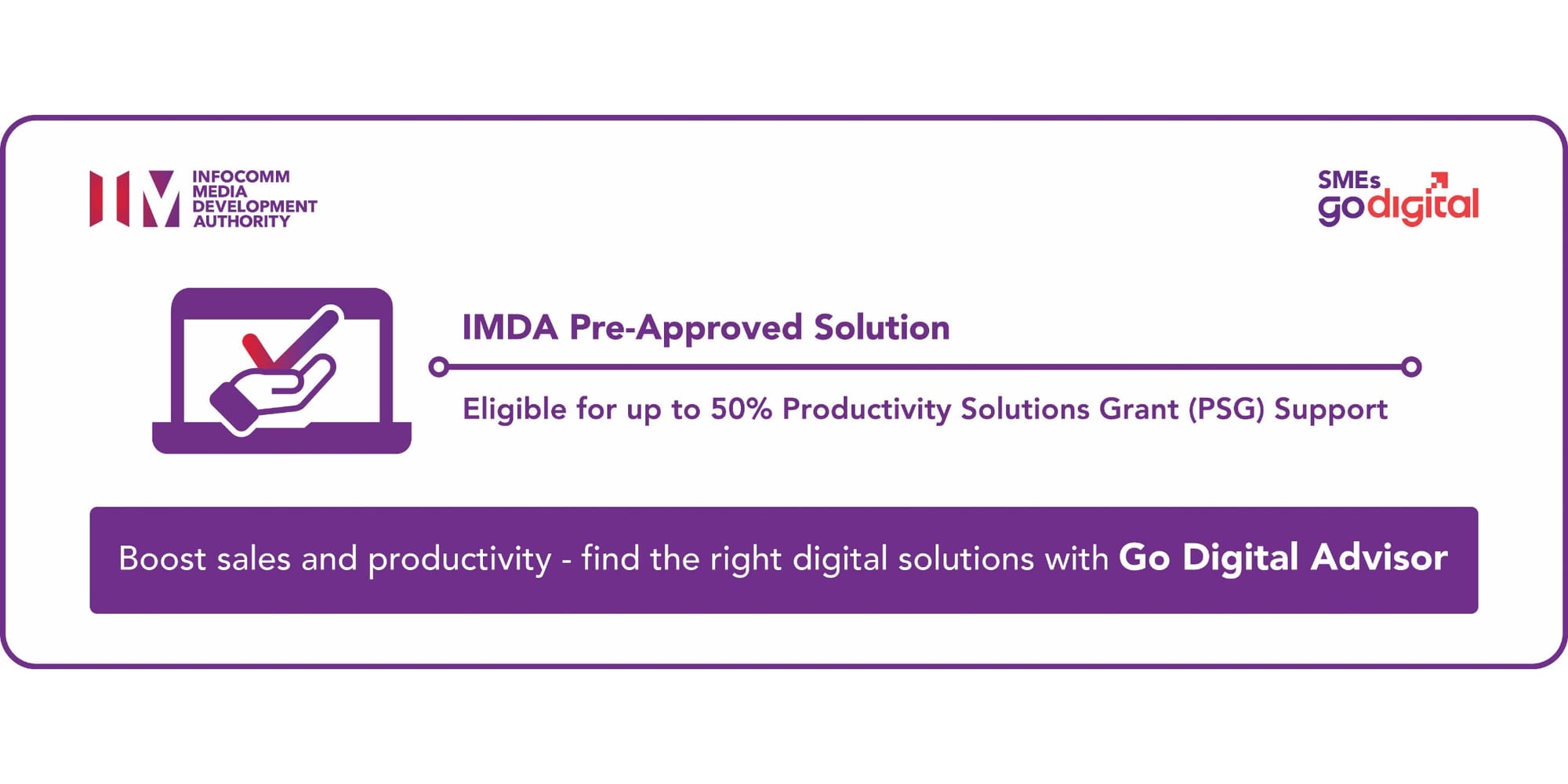 SMEs are eligible for up to 50% Productivity Solutions Grant (PSG) support for the adoption of Pepper Cloud CRM solution, a Pre-Approved Solution under the IMDA SMEs Go Digital programme.