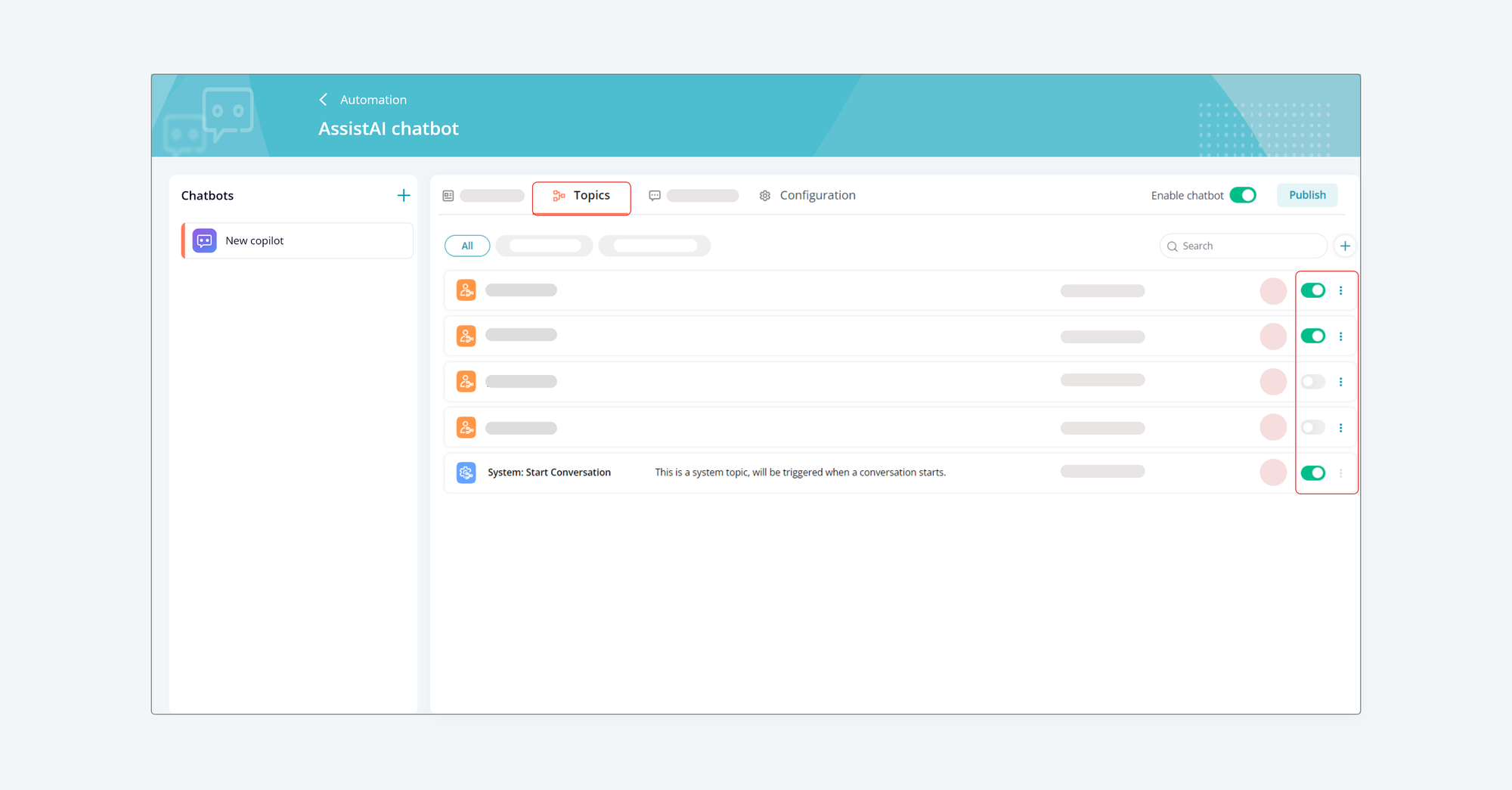 Go ahead and start configuring your topics and create and enable the AssistAI chatbot right away.