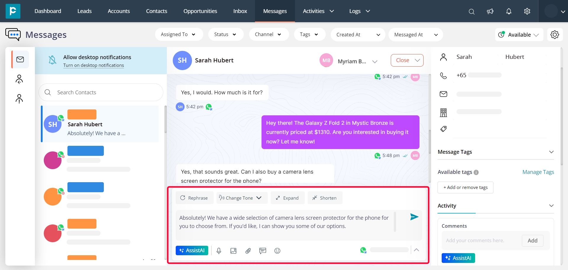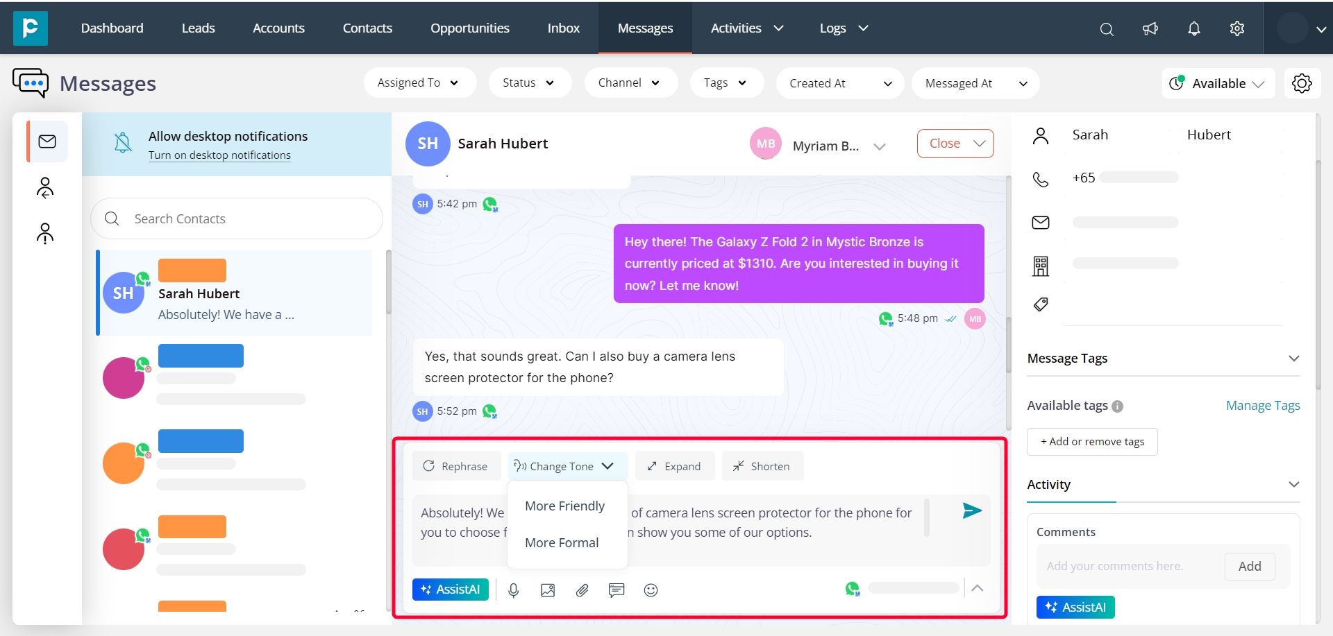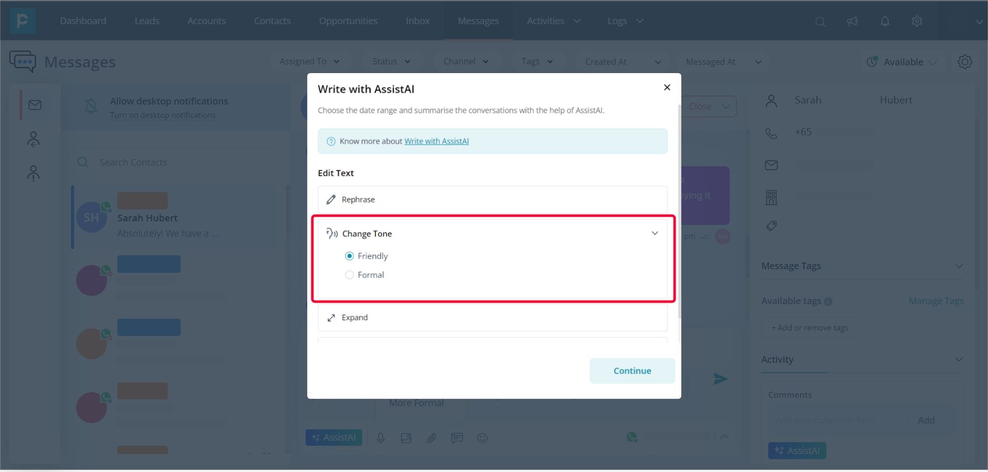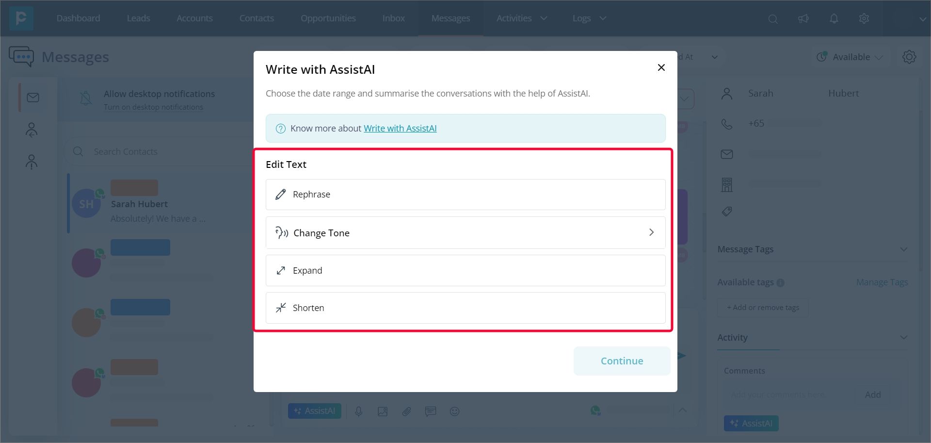 Pepper Cloud’s AssisAI, an AI-driven tool, is introducing a host of new features in the CRM. These features will be available for all our users and will enable them to summarise, rephrase, expand, shorten, and even change the tone of text inputs as and when required.