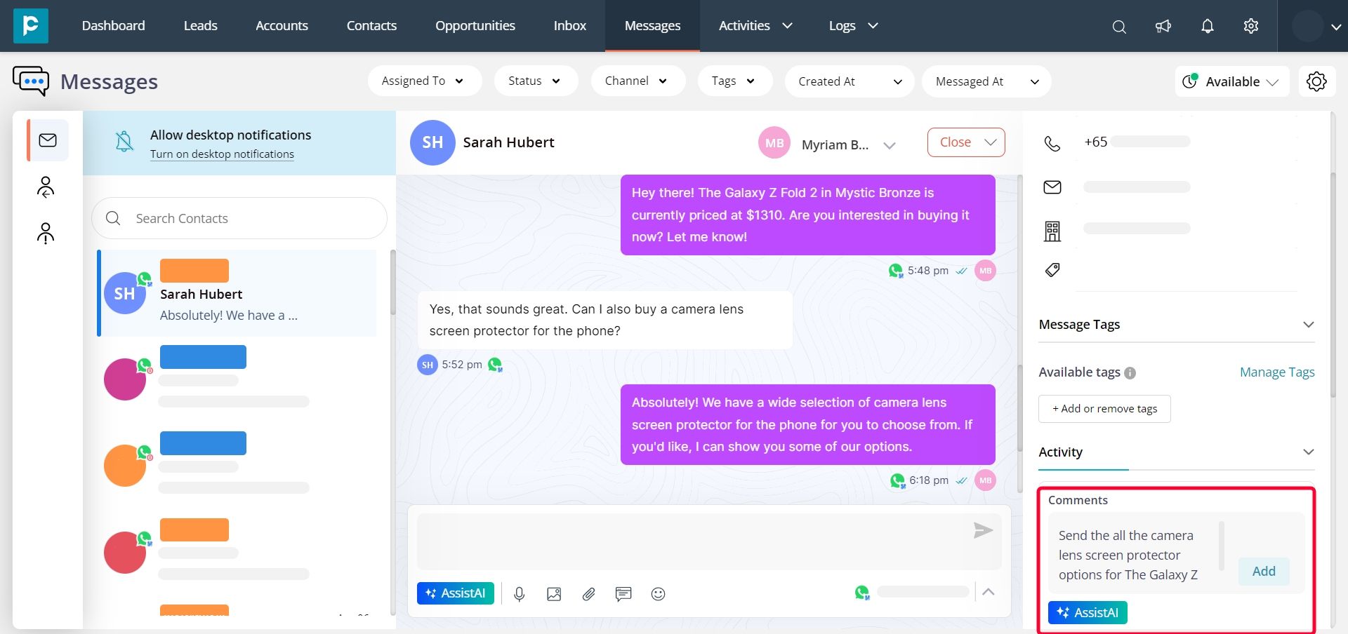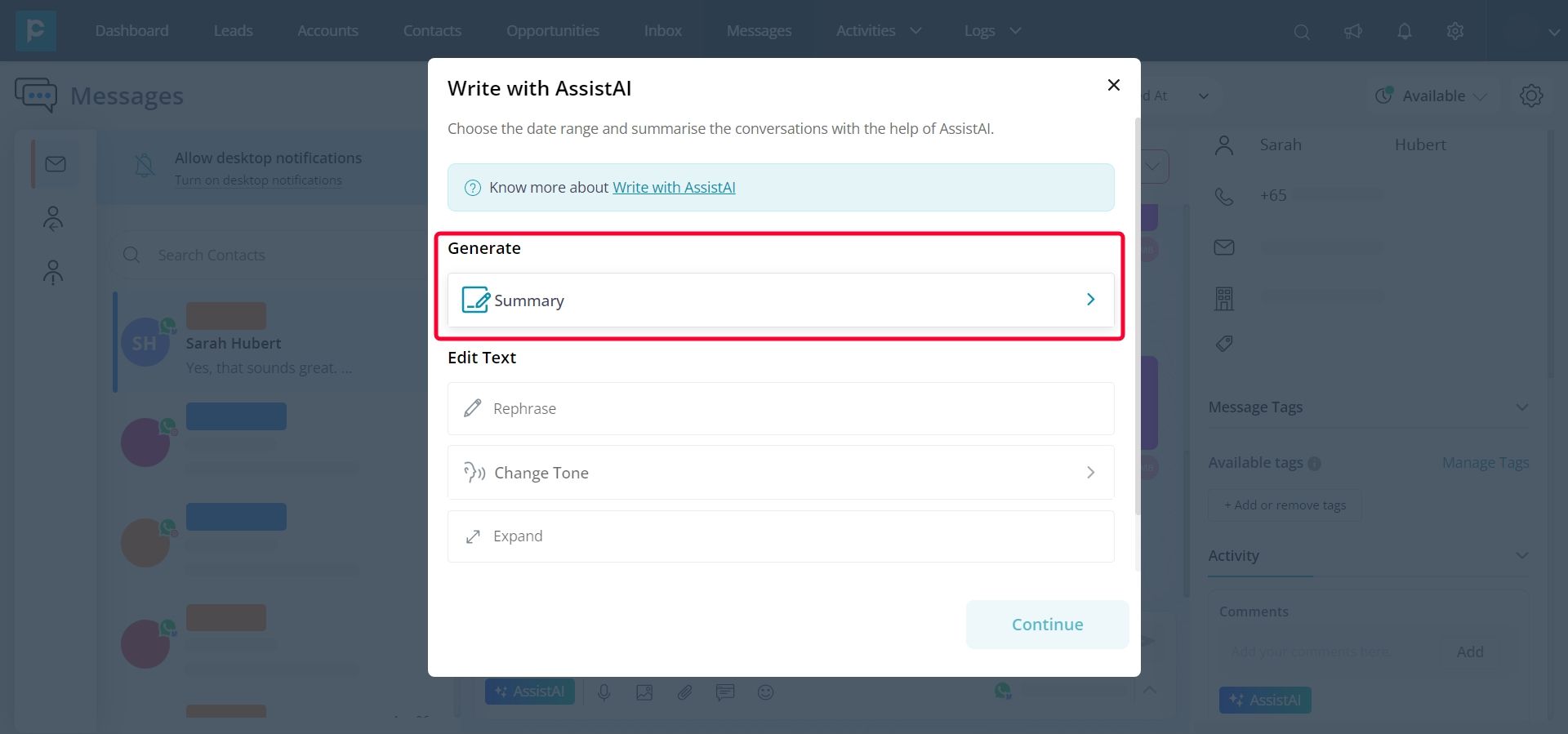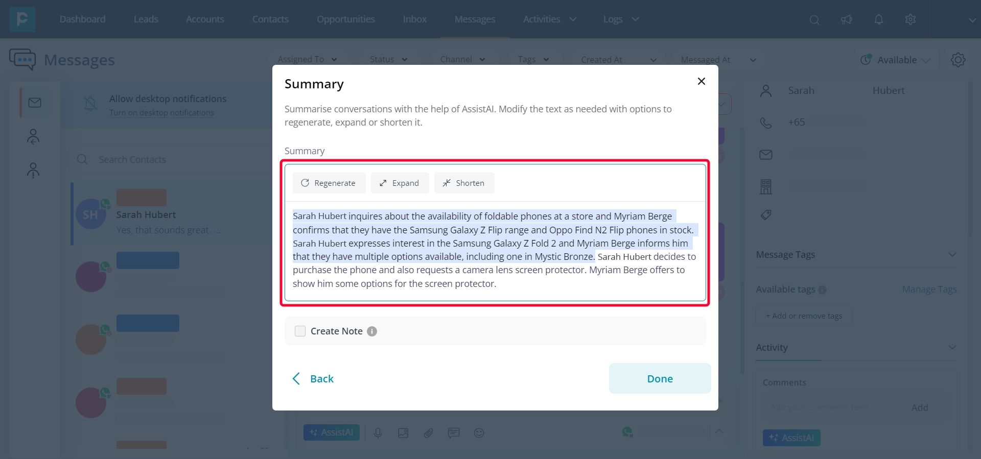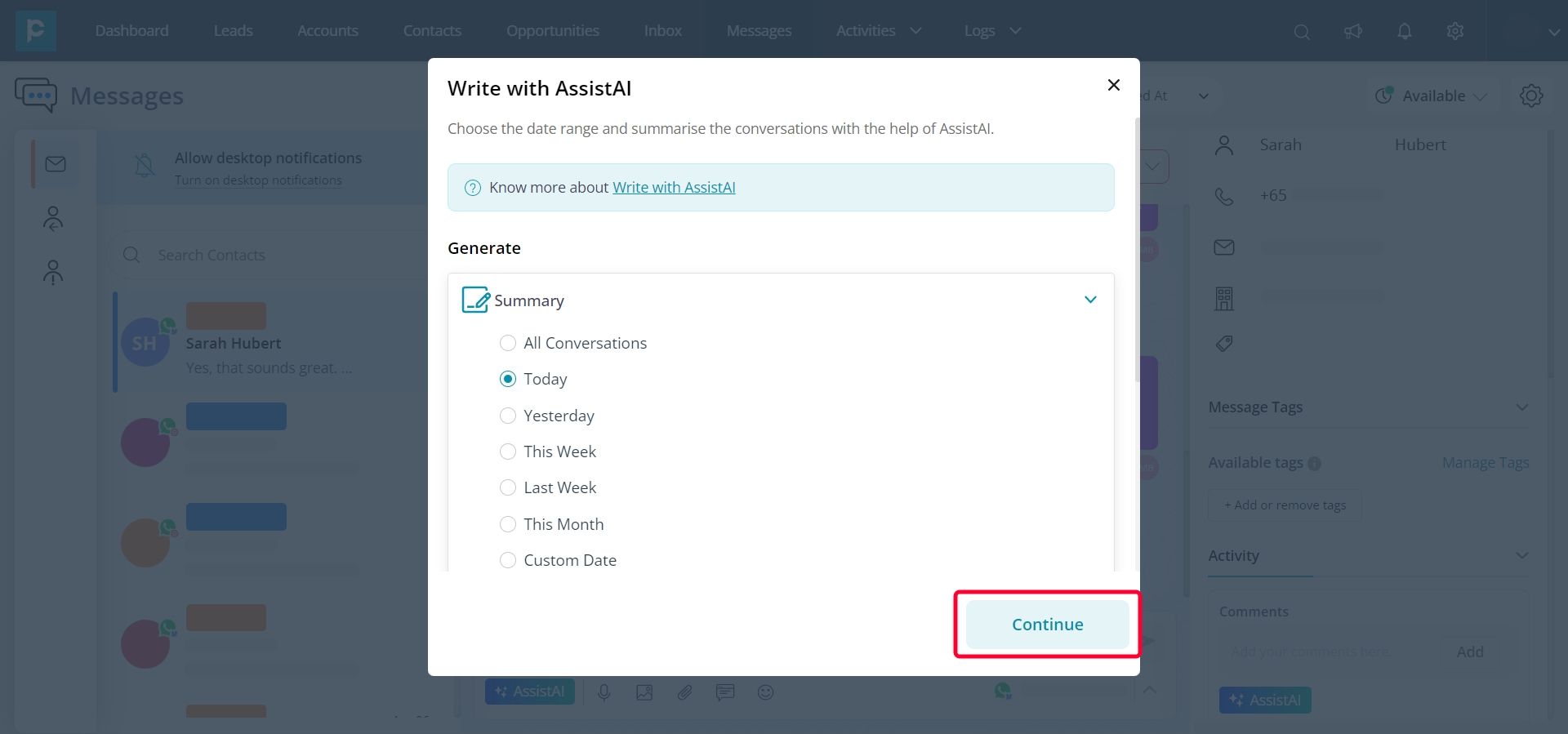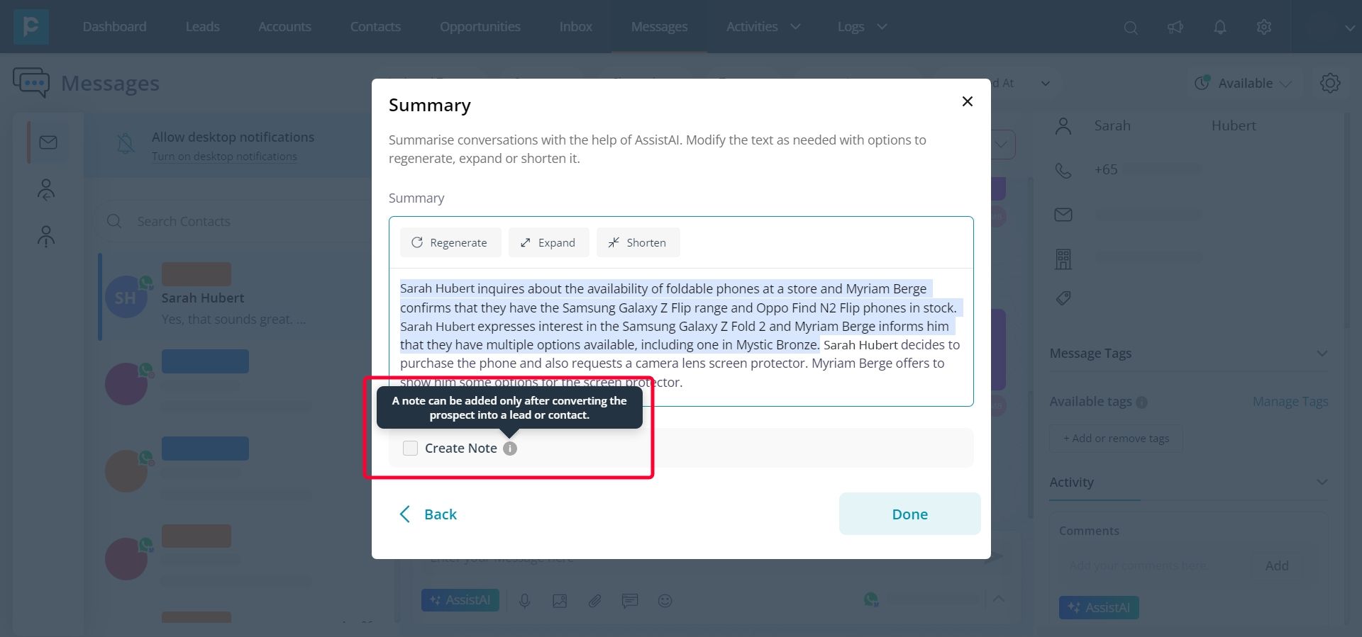 Users can also generate the summary and add it in comments for future references and convert it into notes when a prospect is converted into a 'Lead' or 'Contact'. Additionally, the conversation can also be summarised for a specific date range.