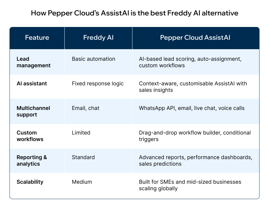 Pepper Cloud AssistAI delivers smarter automation, multichannel communication, and advanced CRM intelligence, making it a powerful alternative to Freddy AI for fast-growing sales and support teams.