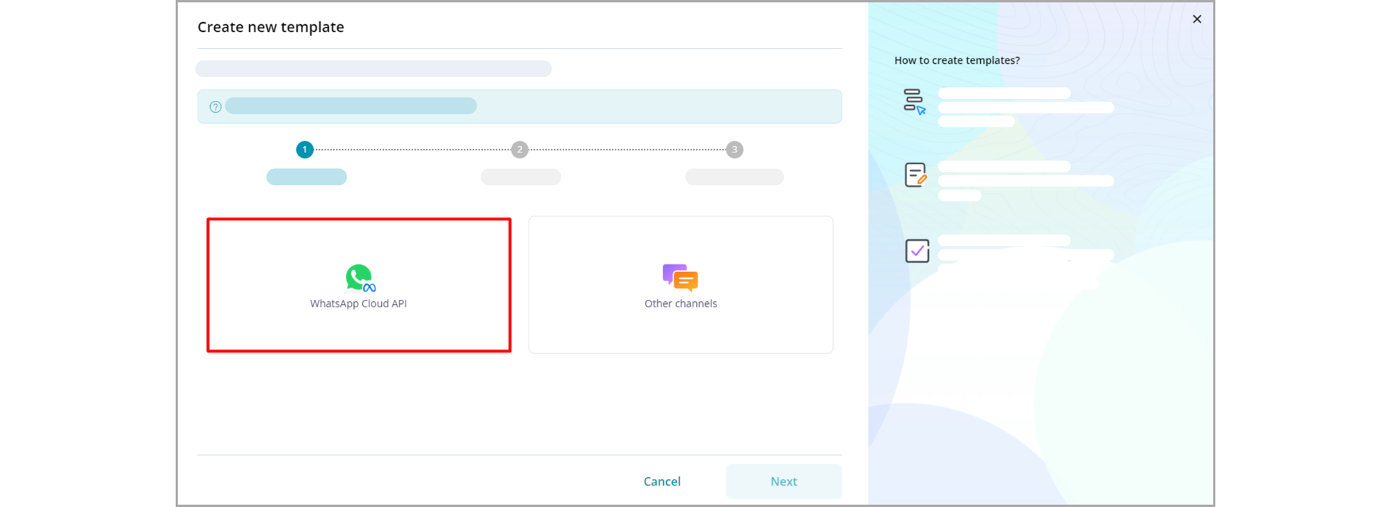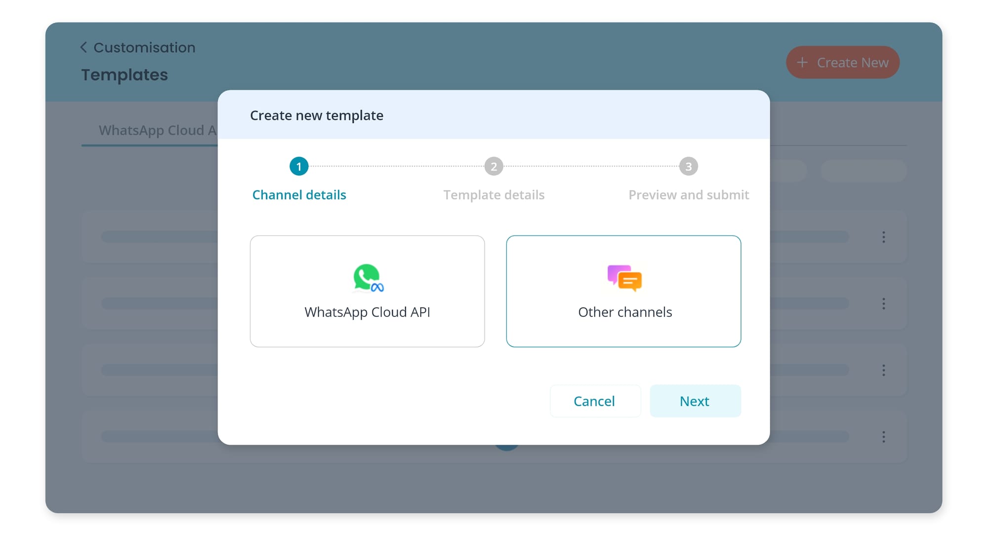 - In the “Create new template” screen, select the channel as WhatsApp Cloud API and click “Next”.