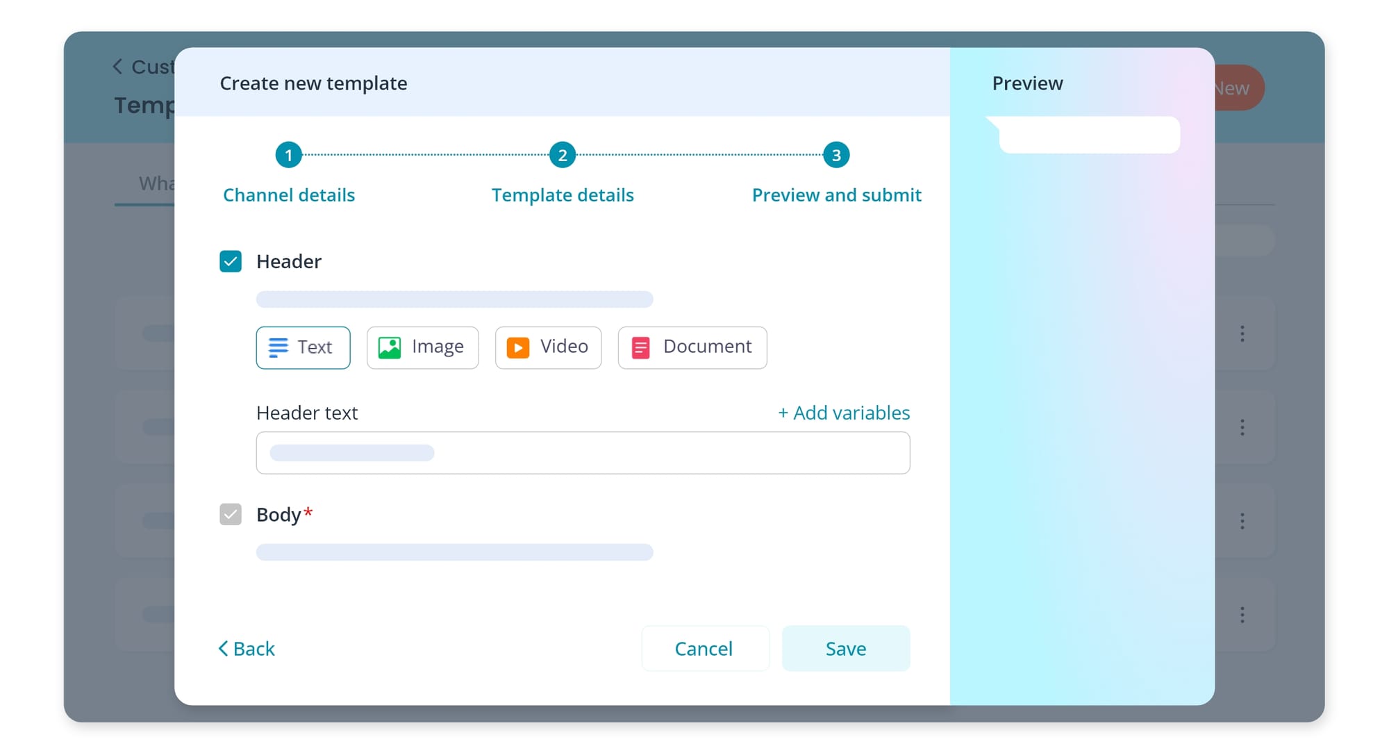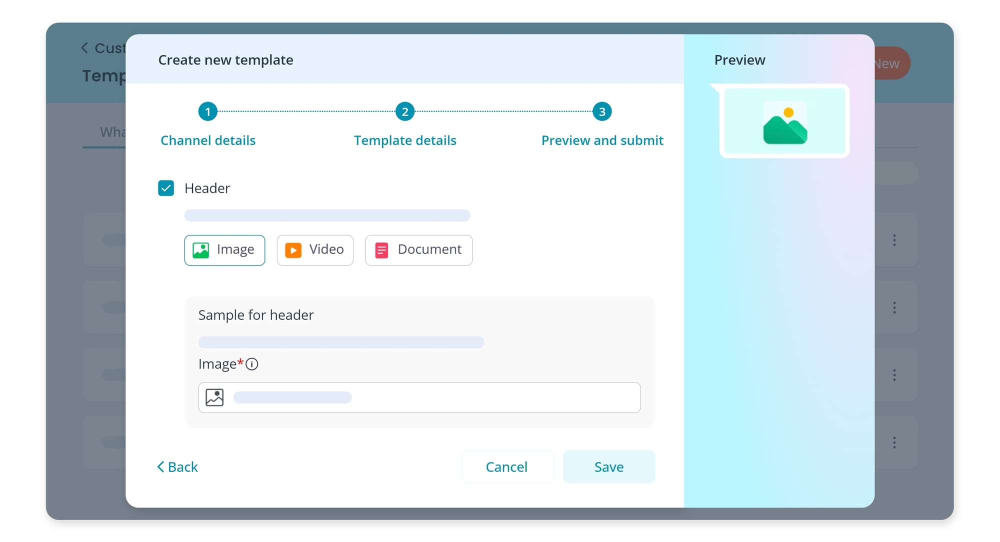 - Proceed to the next screen and fill in the required details for header, body, footer, and buttons. For media header (such as text, clipped image, video, and document), you need to add a sample media file. This is required for Meta to approve your template.