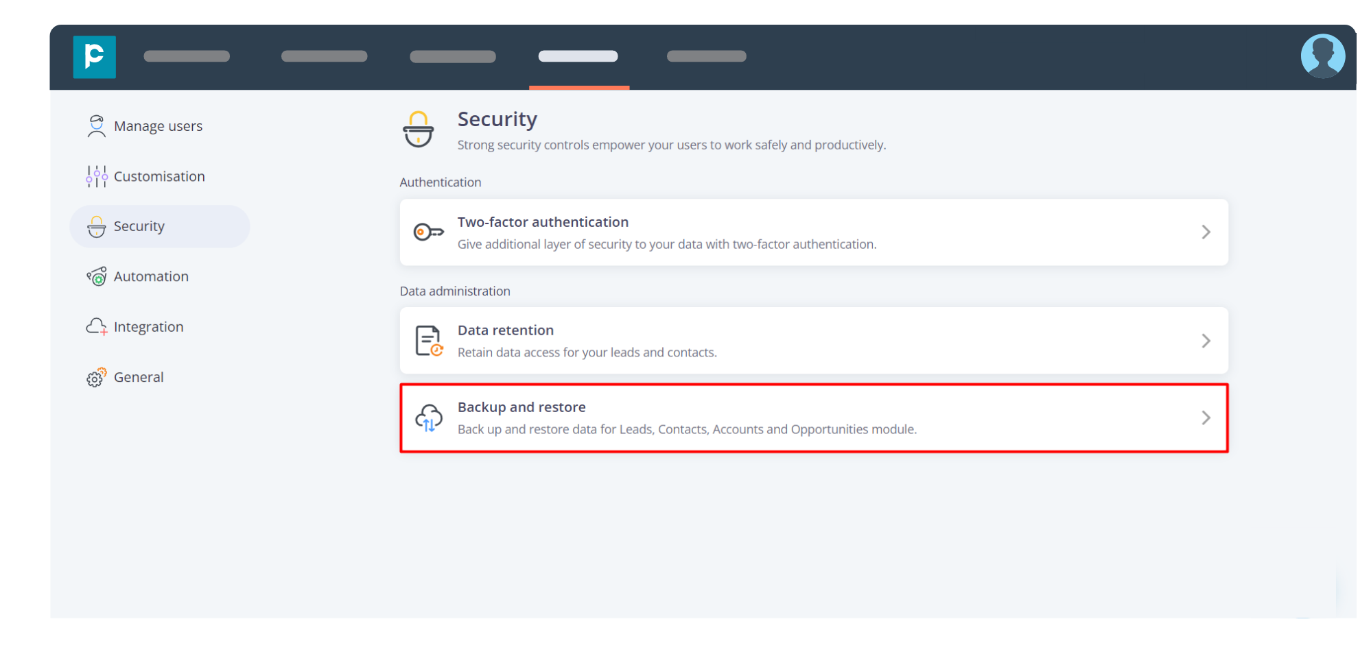 - After logging into your Pepper Cloud CRM account, follow the first 3 steps in the same way as mentioned for data backup.