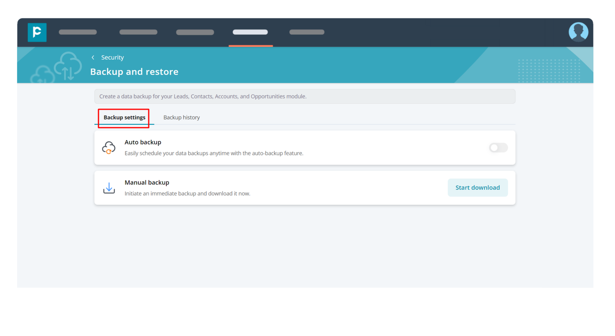 - Manual backup: By selecting the “Manual backup” option, you can immediately start downloading the CRM data for backup.
