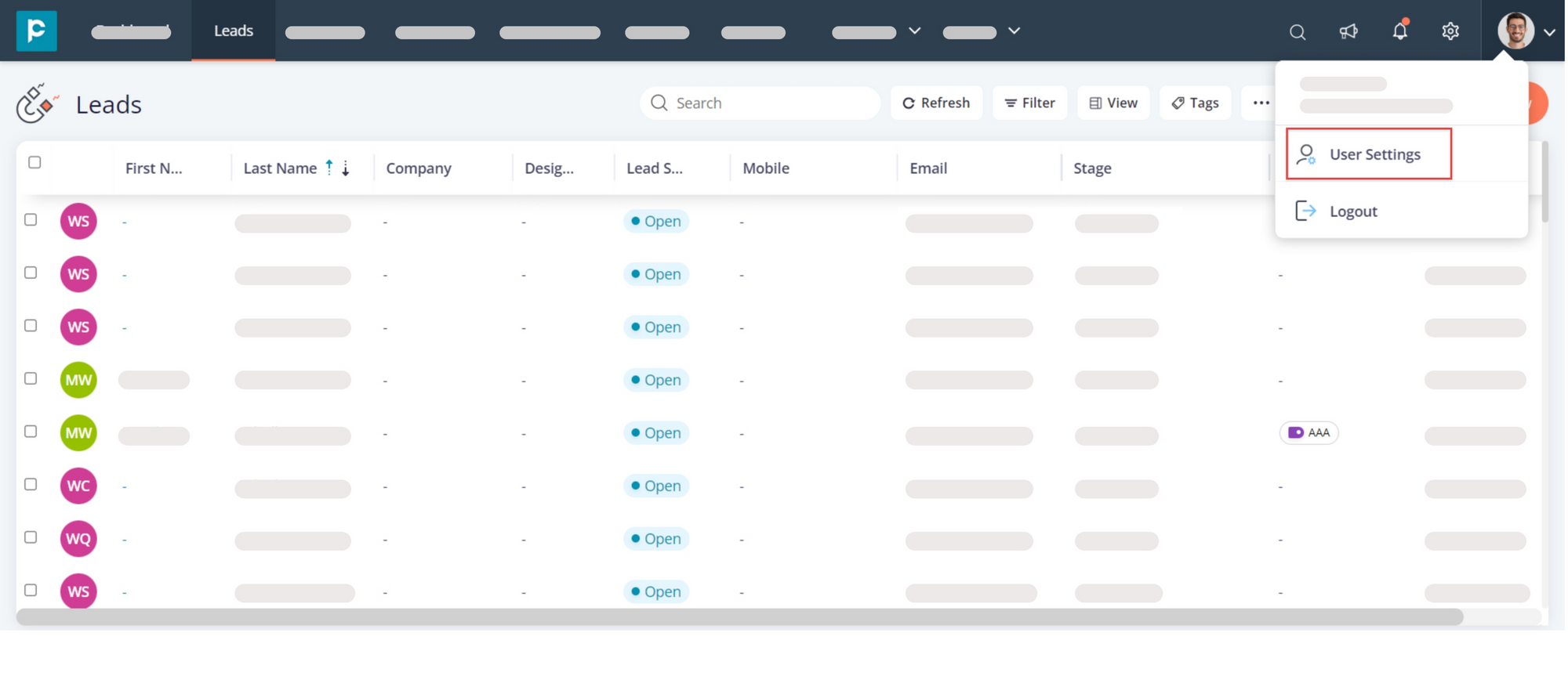 Step 1: Log in to Pepper Cloud CRM, tap on the drop-down button next to your profile image, and select "User Settings".