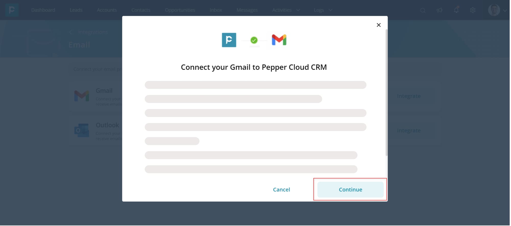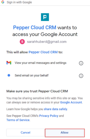 Choose an email account that you would like to integrate with Pepper Cloud CRM.