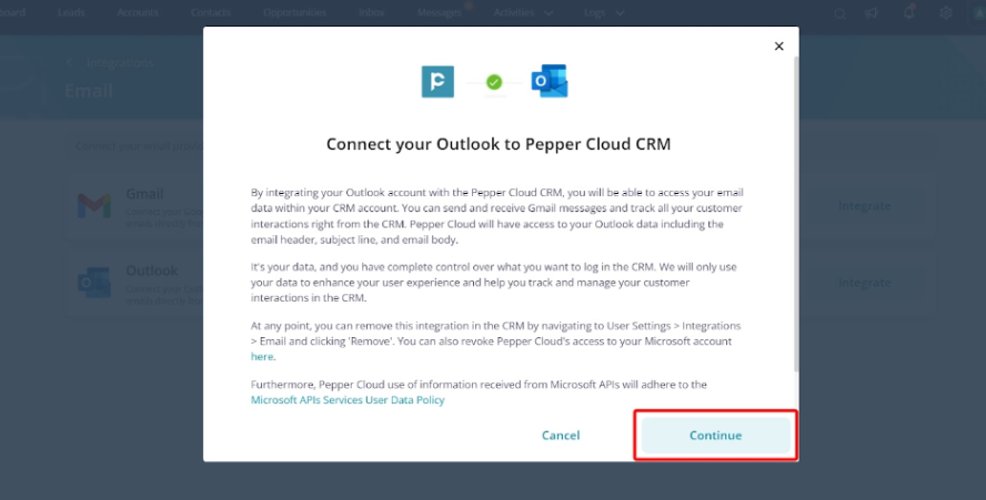 In the next section let’s find out how you can easily integrate your Gmail and Outlook inboxes with Pepper Cloud CRM.