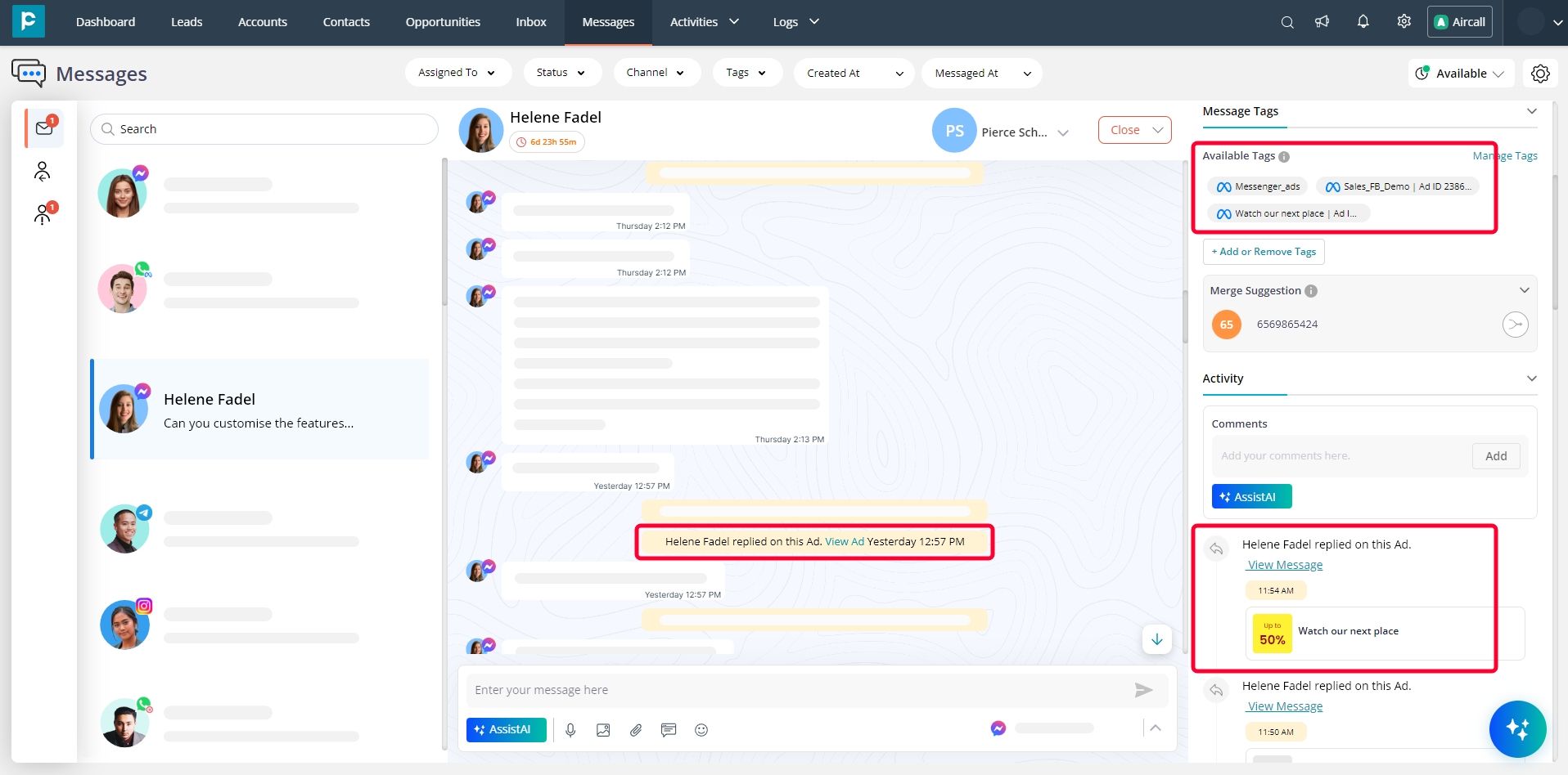3. When a potential customer clicks on the ad and sends a message, the message will be displayed within the CRM, much like the way it appears in Meta Business Suite.