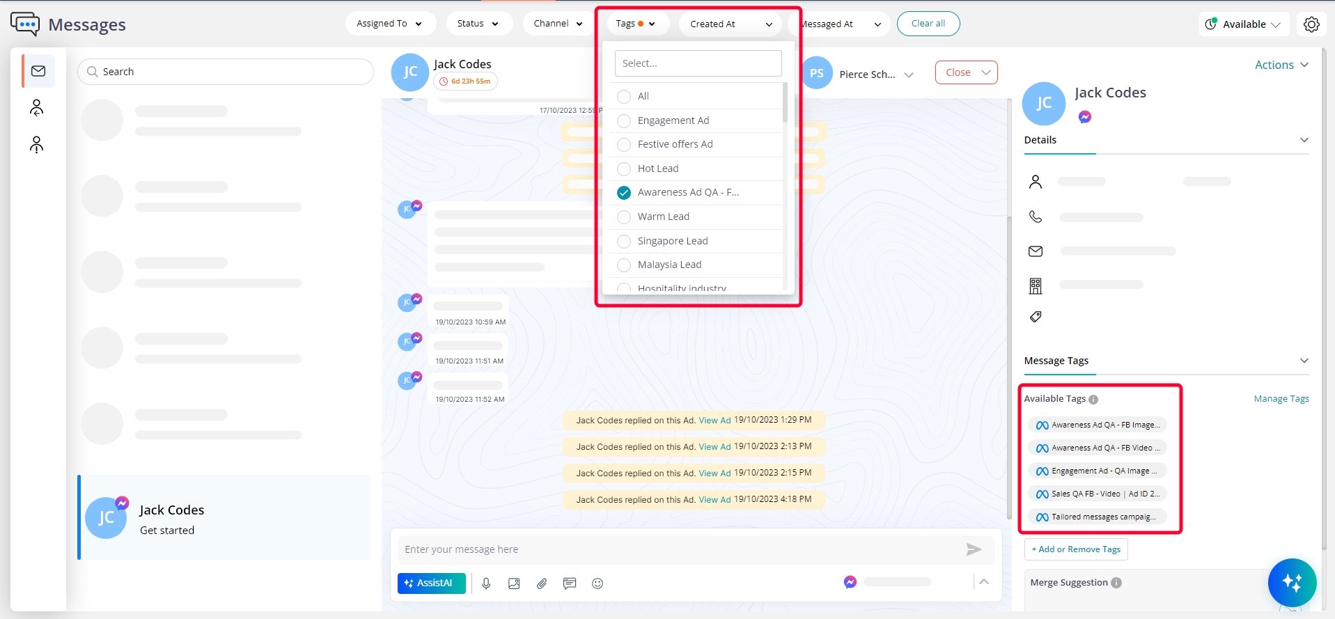 - Message tags: These are the tags that have been added to the records and conversations manually by the user or businesses. These tags can be modified or deleted by the businesses.