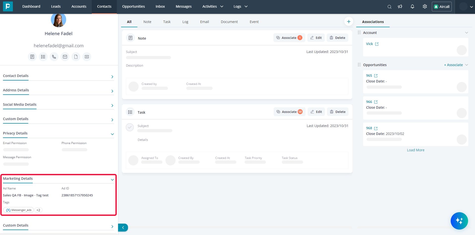 When the business converts a conversation into a lead or contact, the ad details will be transferred to the marketing details section of the record detail page. It contains the following information: