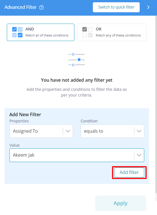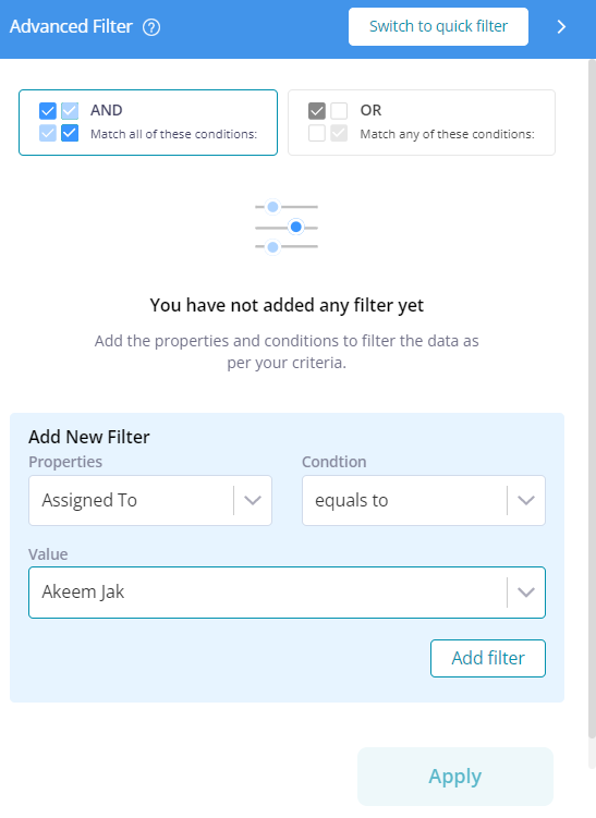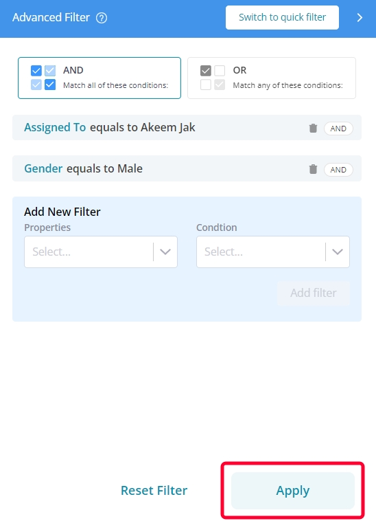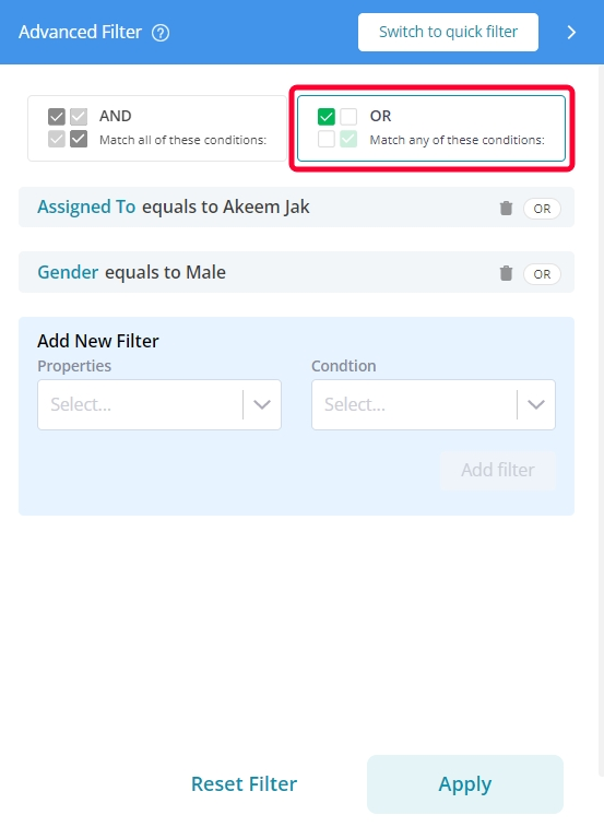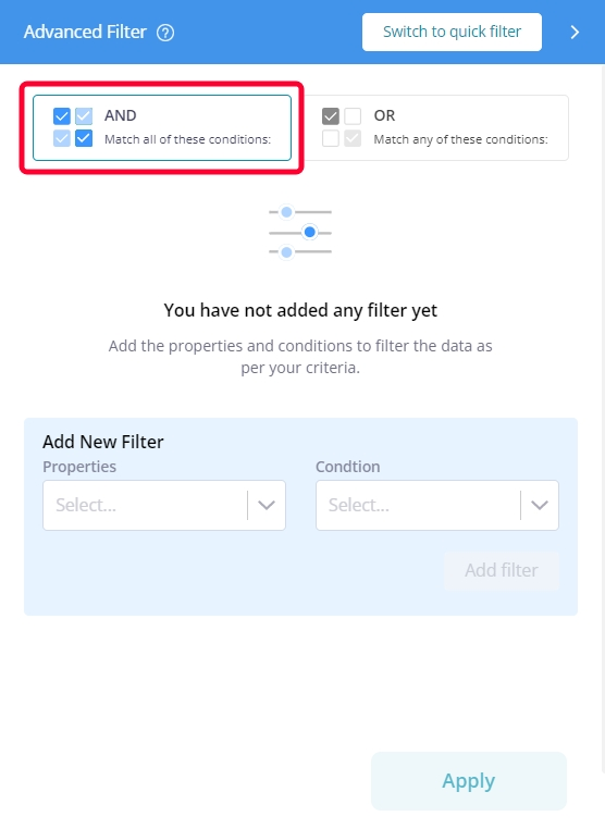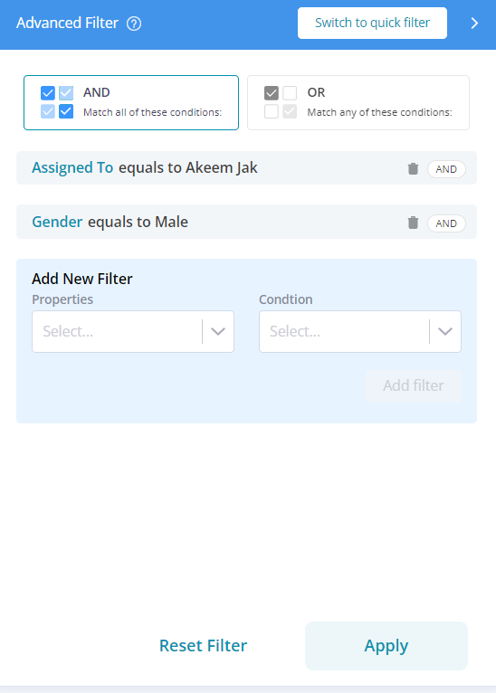 AND: With the AND condition, you are allowed to select multiple properties and conditions for filtering records. This filter ensures that only results that meet all the provided criteria are displayed.