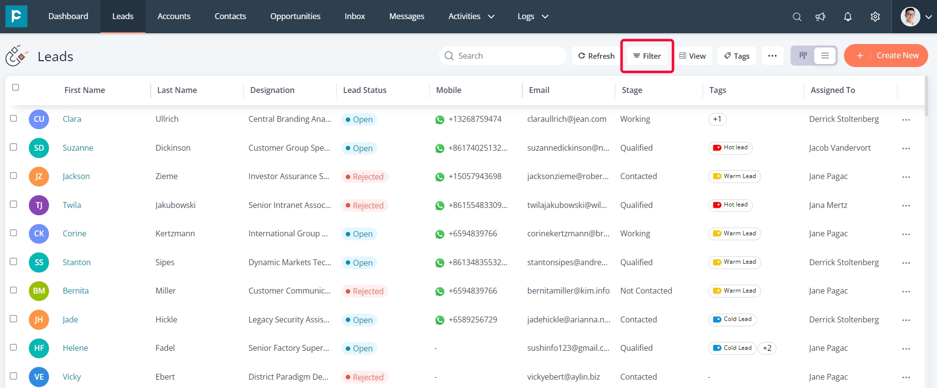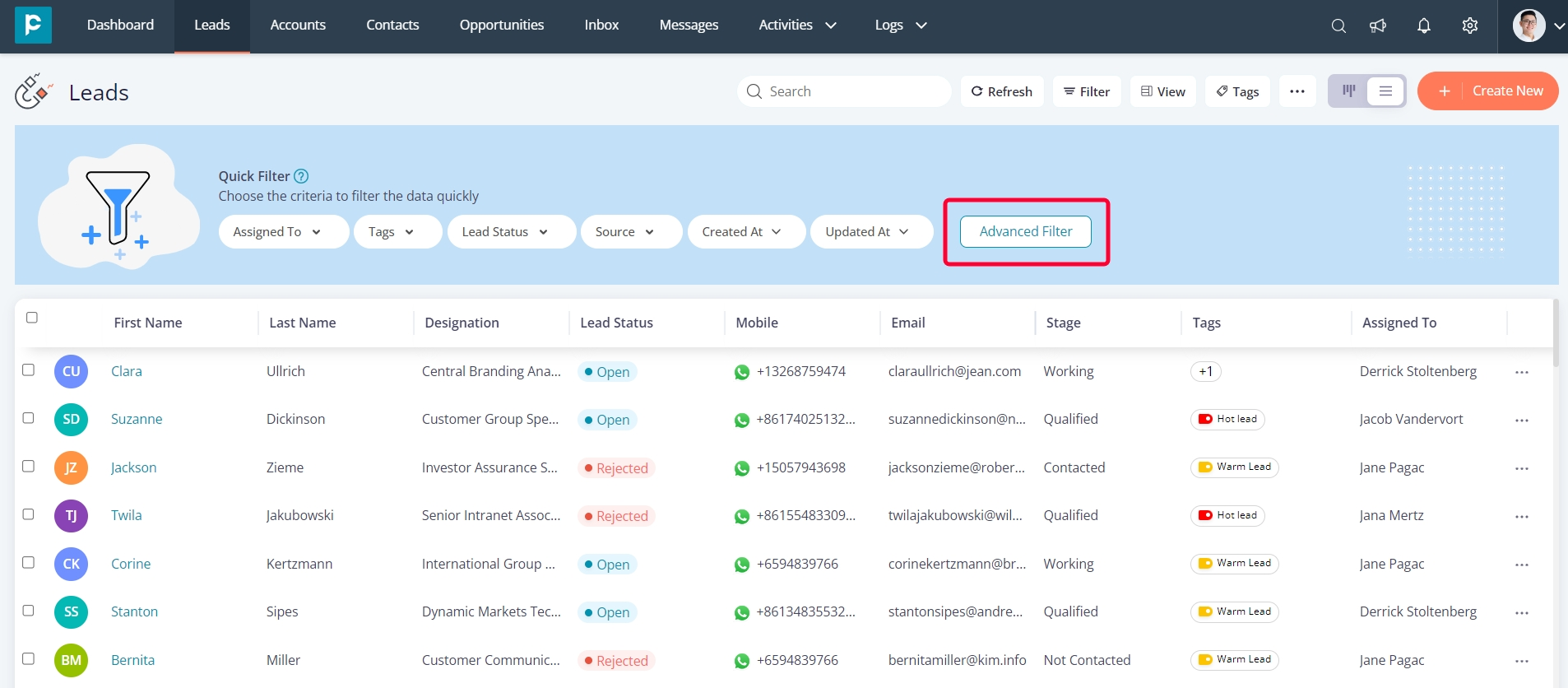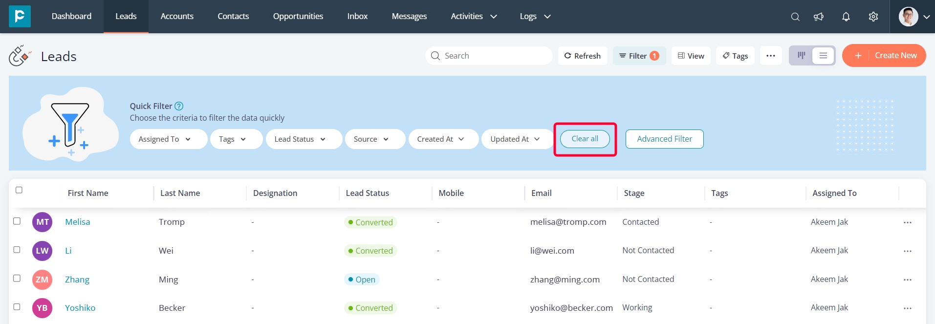 Lead Status: Filtering by “Lead Status” enables you to sort records based on their status, whether they are open, converted, or rejected.