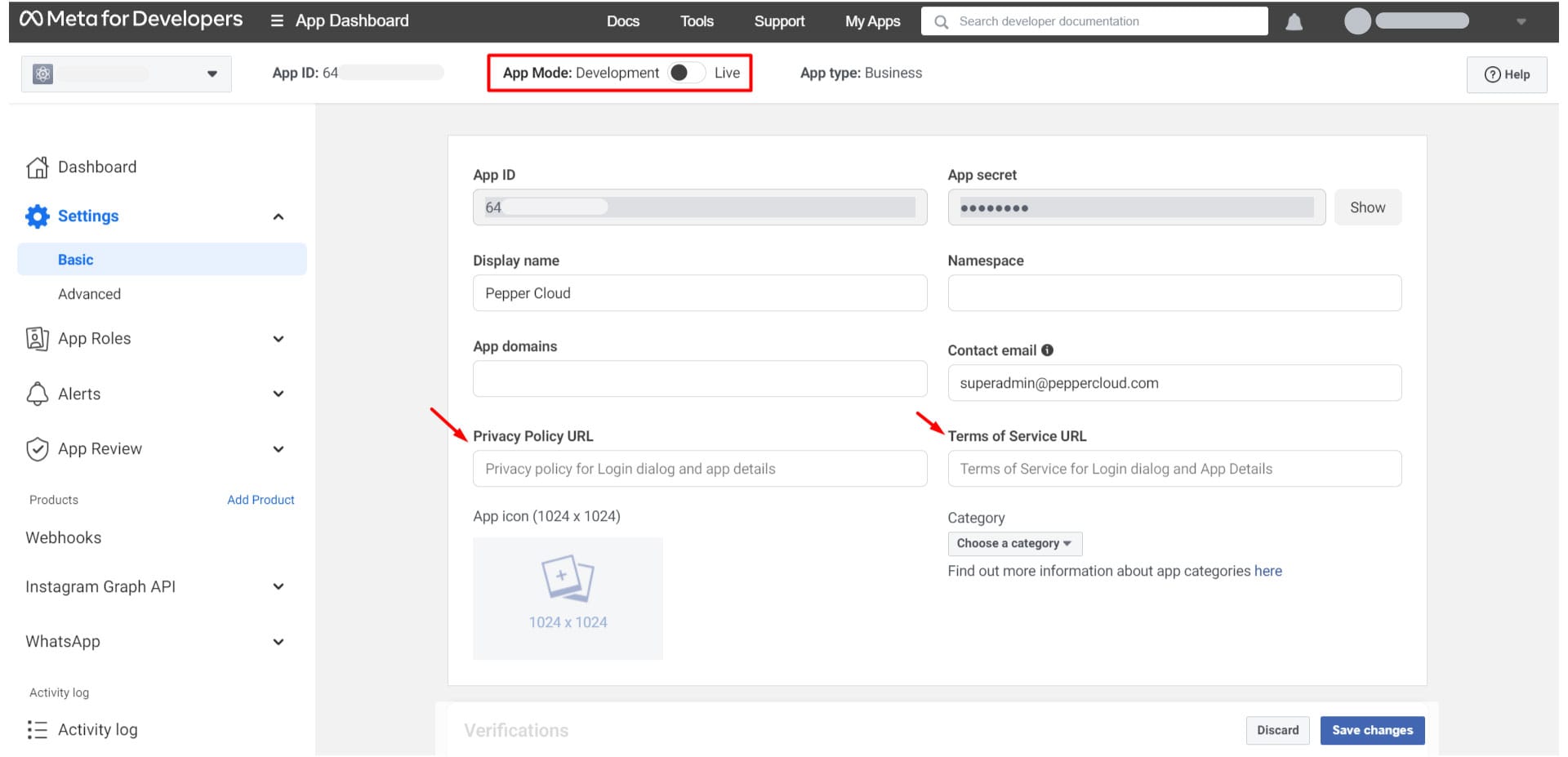 c) To make the app live, enter your Privacy policy URL and Terms of Service URL from your website here and click “Save Changes”.