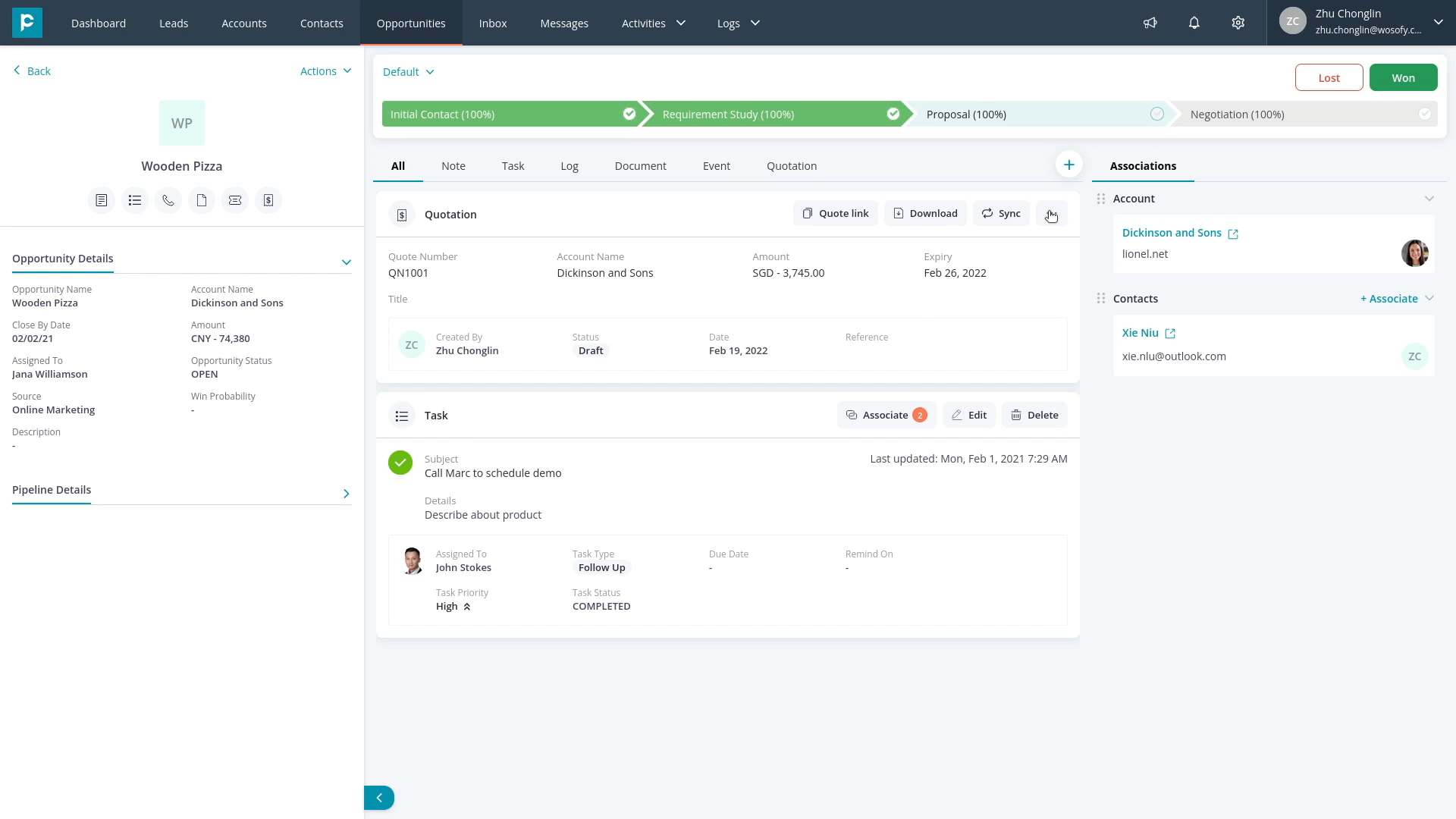 2. On the details page of Opportunity, go to “Quotations” on the activity tab.