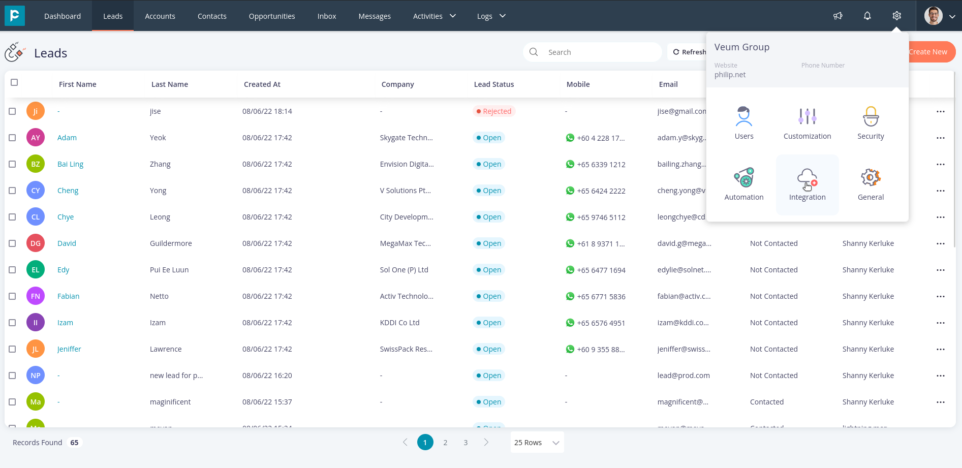- To search the leads: Click on the search icon and search the leads by the fields.