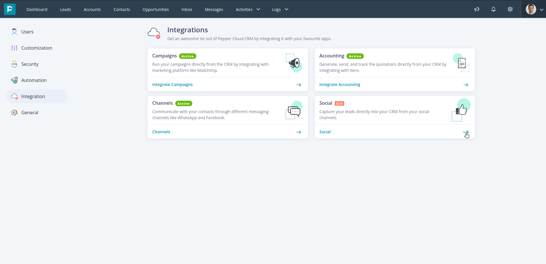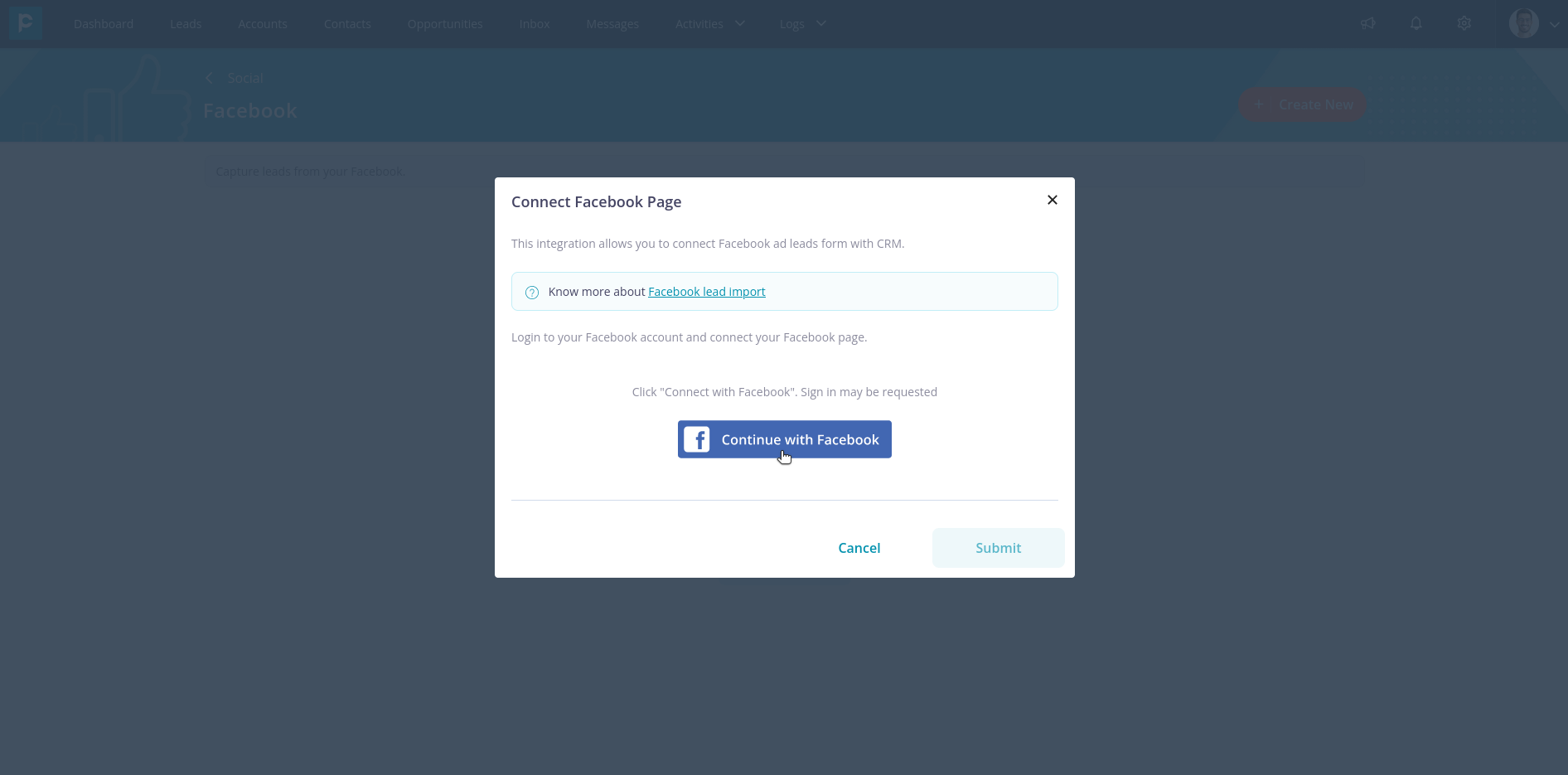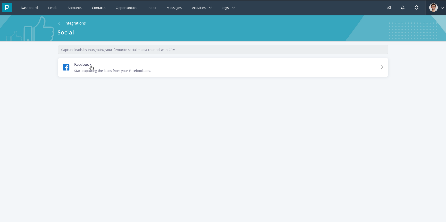 5. Click on “Facebook” to integrate your Facebook pages with CRM.
