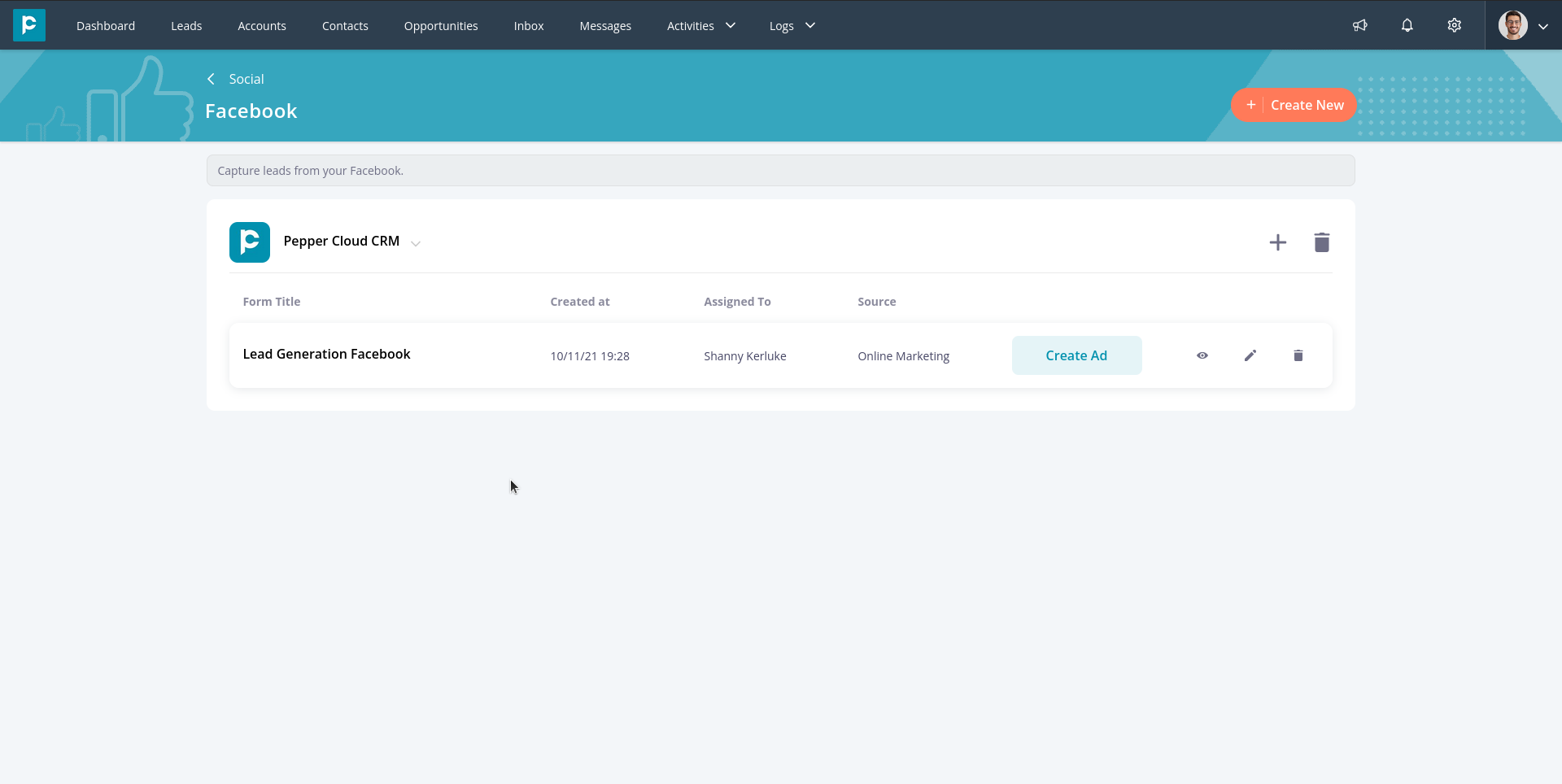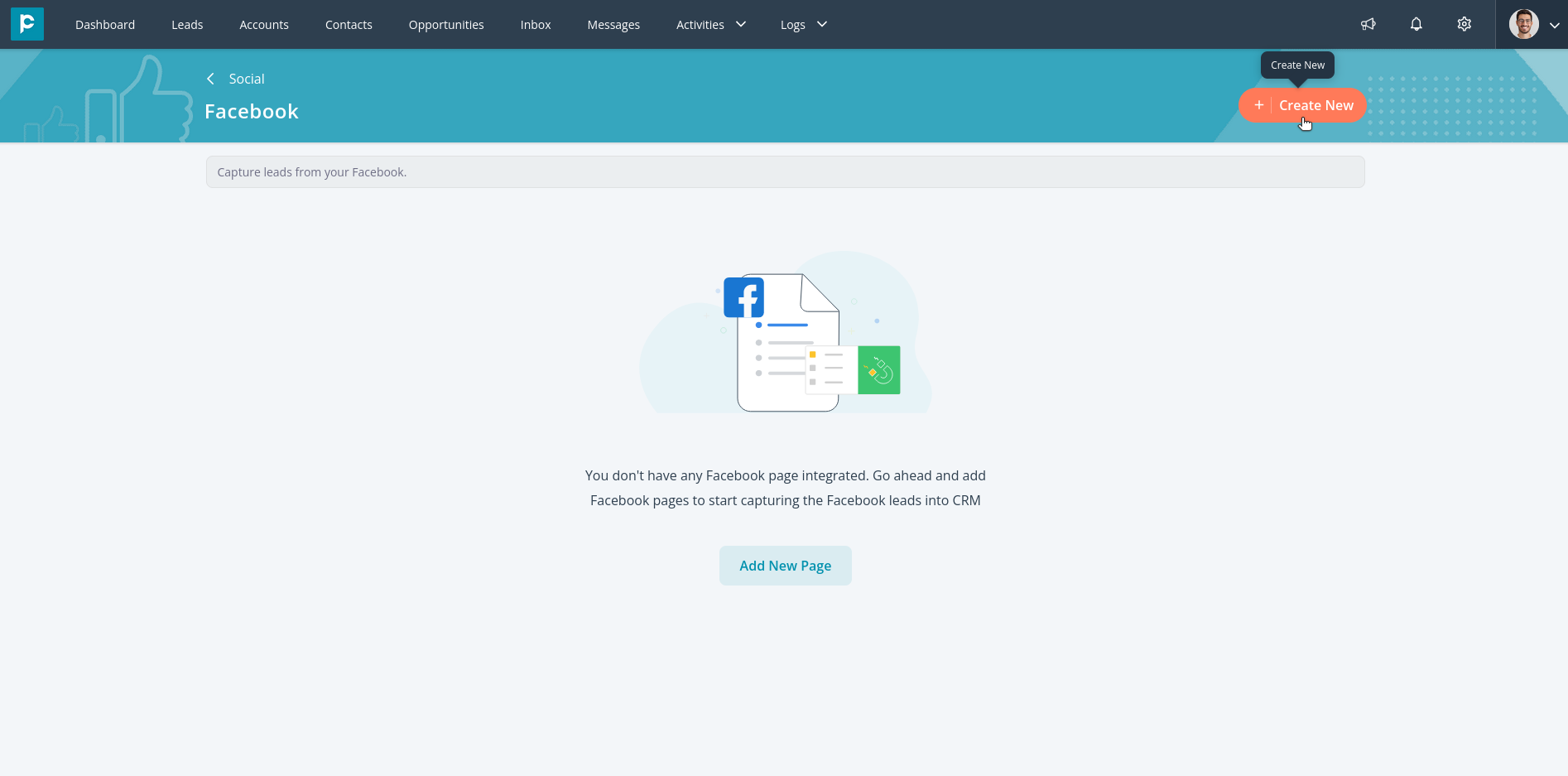 6. Click on the "Create New" button in the top right to integrate the new Facebook page.