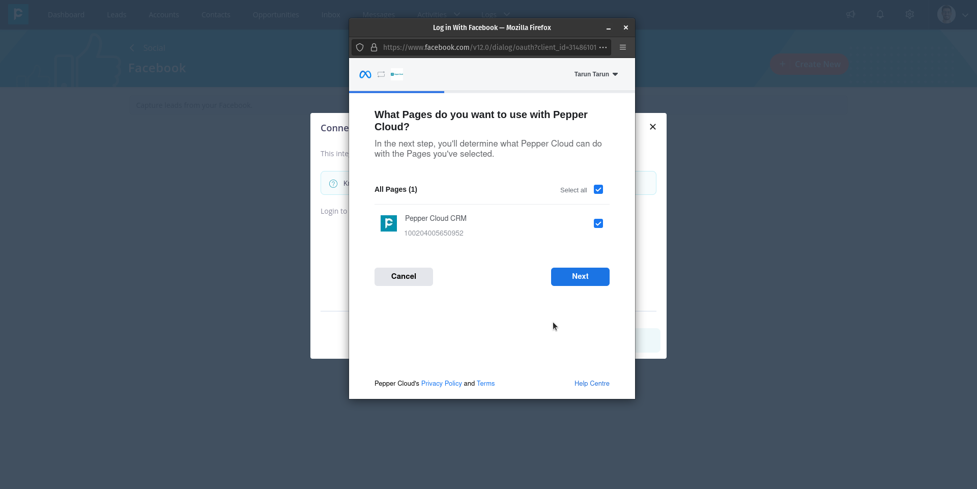 8. It might ask you to log in to your Facebook account. If so, log in and choose the pages you want to integrate with the CRM.