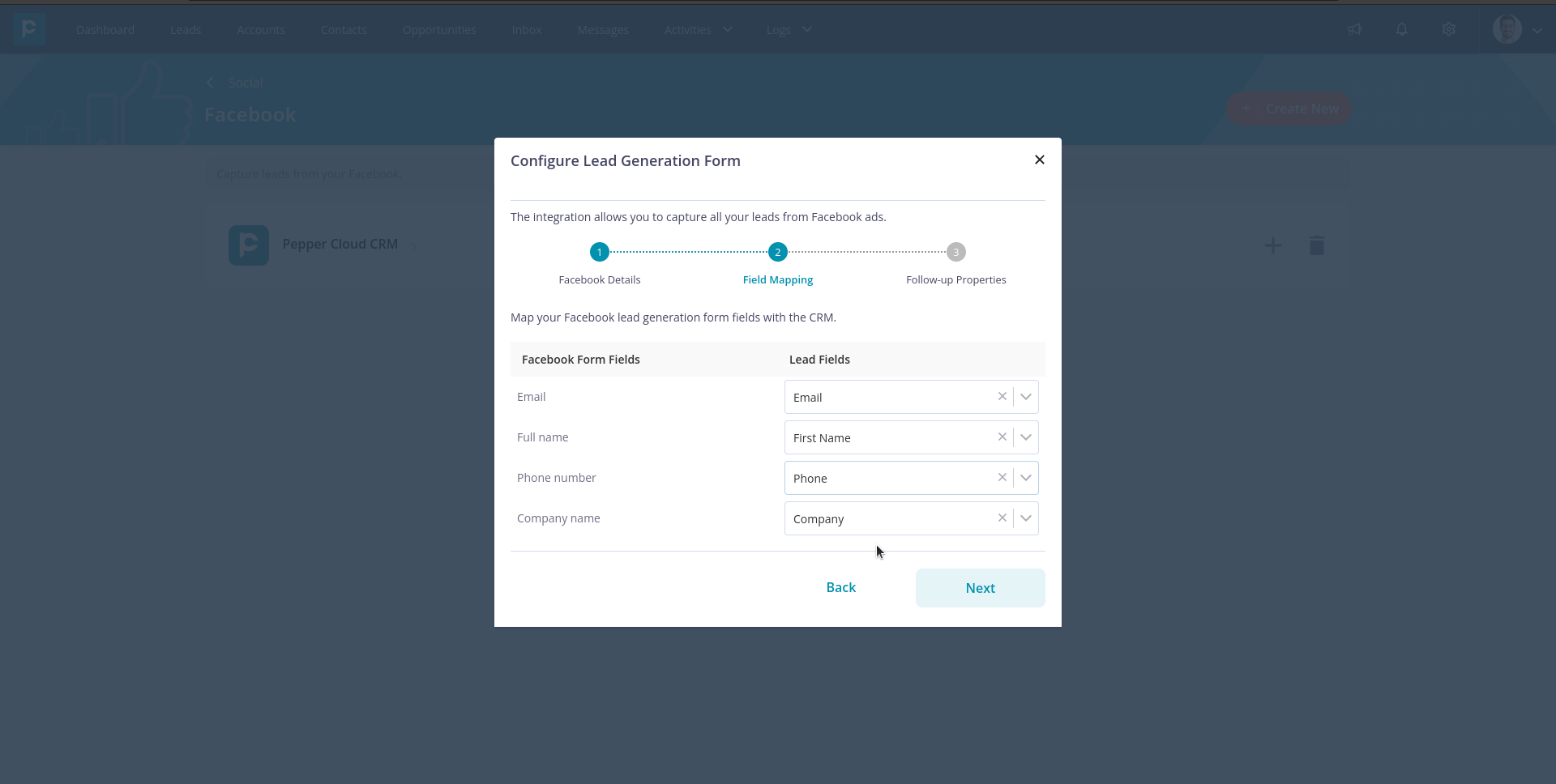 2. Map your facebook fields with CRM Fields and then, click “Next”.