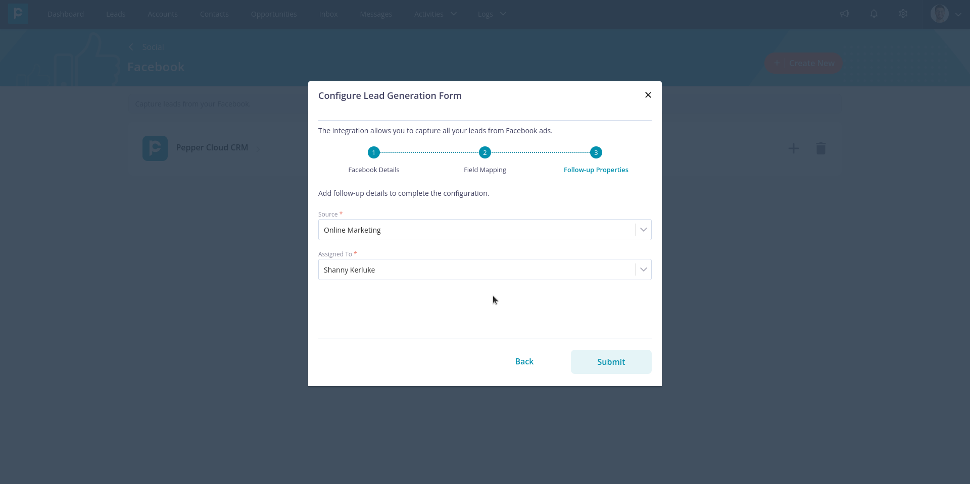 3. Select your default follow-up properties for the leads generated through the Facebook ad form. Click “Submit” to complete the configuration.
