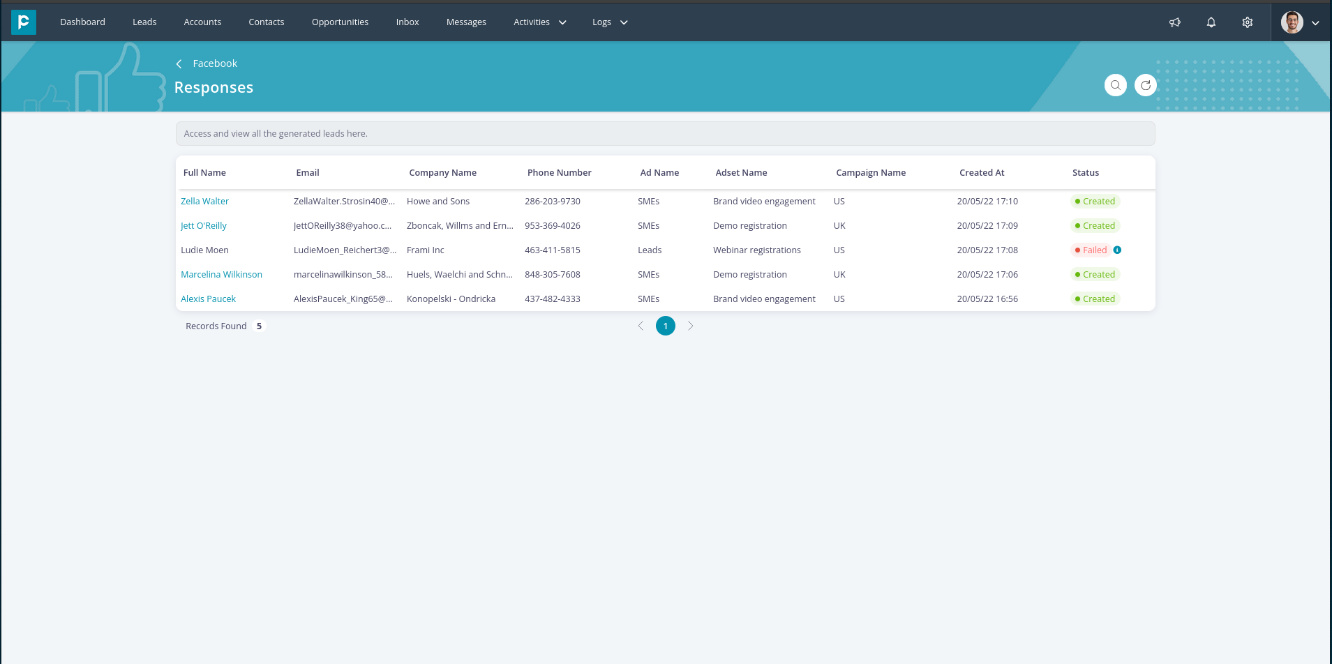 - To check the Facebook ad-generated leads: Click on the view icon (eye icon). This takes you to the page where you can see the list of responses along with other details such as lead import status, ad name, campaign name, etc.