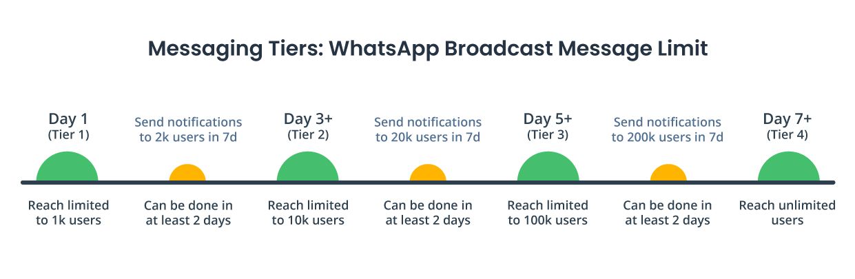 In order to send broadcast messages to a large audience, a WhatsApp account needs to be promoted to a higher Messaging Tier. To do so, businesses must send double the number of messages allowed in the current tier during a 7-day period.