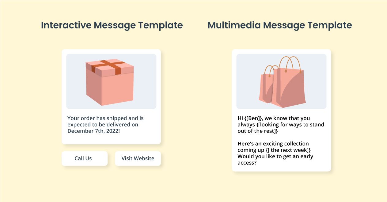 WhatsApp message templates are basically pre-approved customisable messages. With message templates, you can create media templates or, interactive message templates. You can also provide multiple call-to-action buttons or quick reply buttons. Additionally, you can also customise message templates by adding variables in the templates.