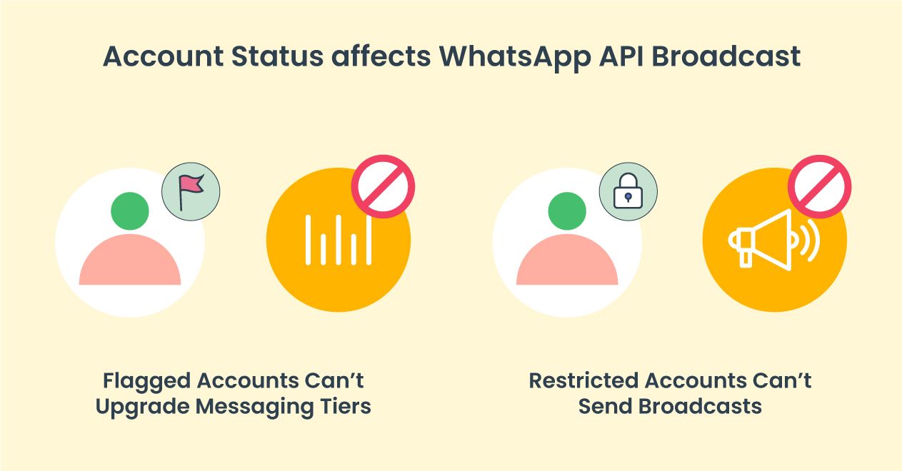 - “Restricted” status: When contacts report or block a number, it receives a low-quality rating. When a phone number sends too many low-quality message templates while exceeding the messaging limit, it receives a “Restricted” status. When a phone number is Restricted, it cannot send broadcasts to new unique Contacts and can only reply to inbound conversations.