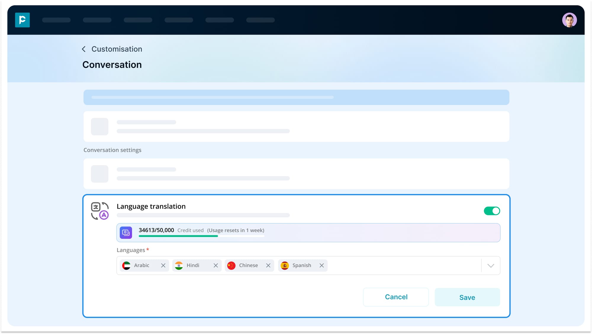 Language translation in Pepper Cloud AI CRM allows users to translate chat messages into their preferred language. Admins can configure up to five supported languages, and users can enable translation per conversation. The feature offers both automatic and manual translation options, with support for real-time and individual message translation.