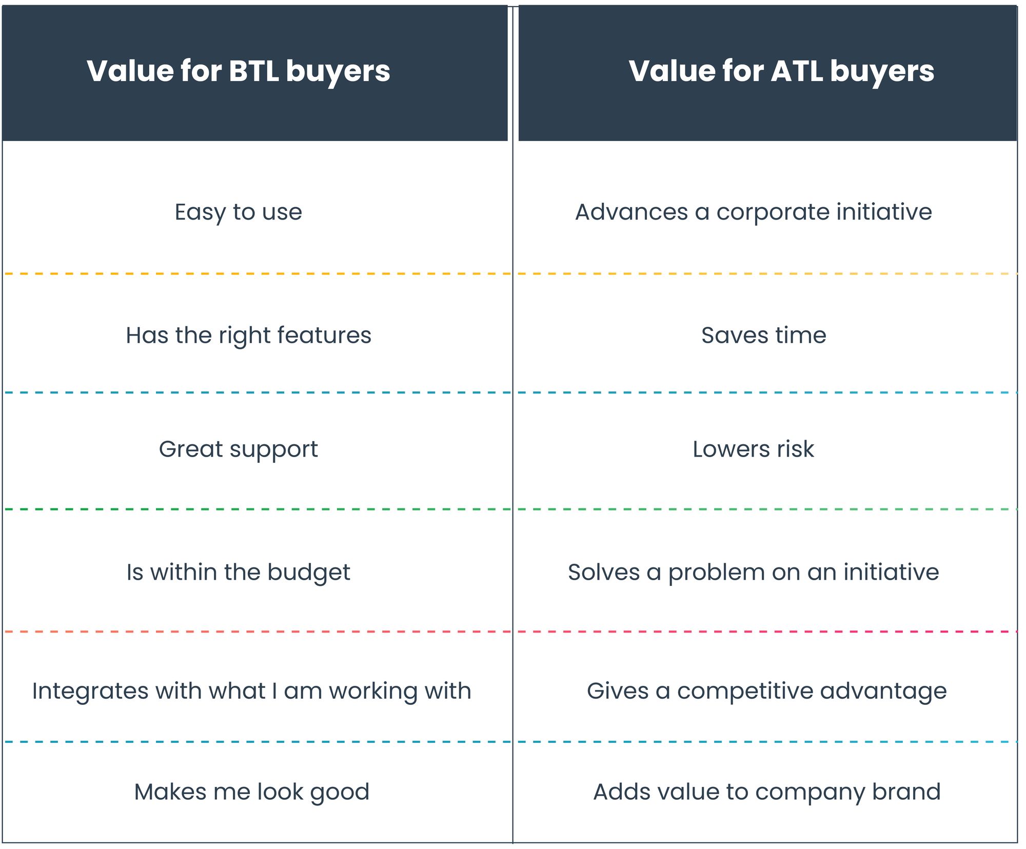 BTL buyers are always inclined towards finding the best alternatives for their organisation. Thus, their considering and reconsidering stage takes forever and one must love this category as they are usually up for buying. Study the concerning topics for both ATL and BTL buyers, learn what they care about and what they need instead of spending time on what you care about and your needs. Mostly, salespeople ignore the ATL value proposition and consider only the BTL way.