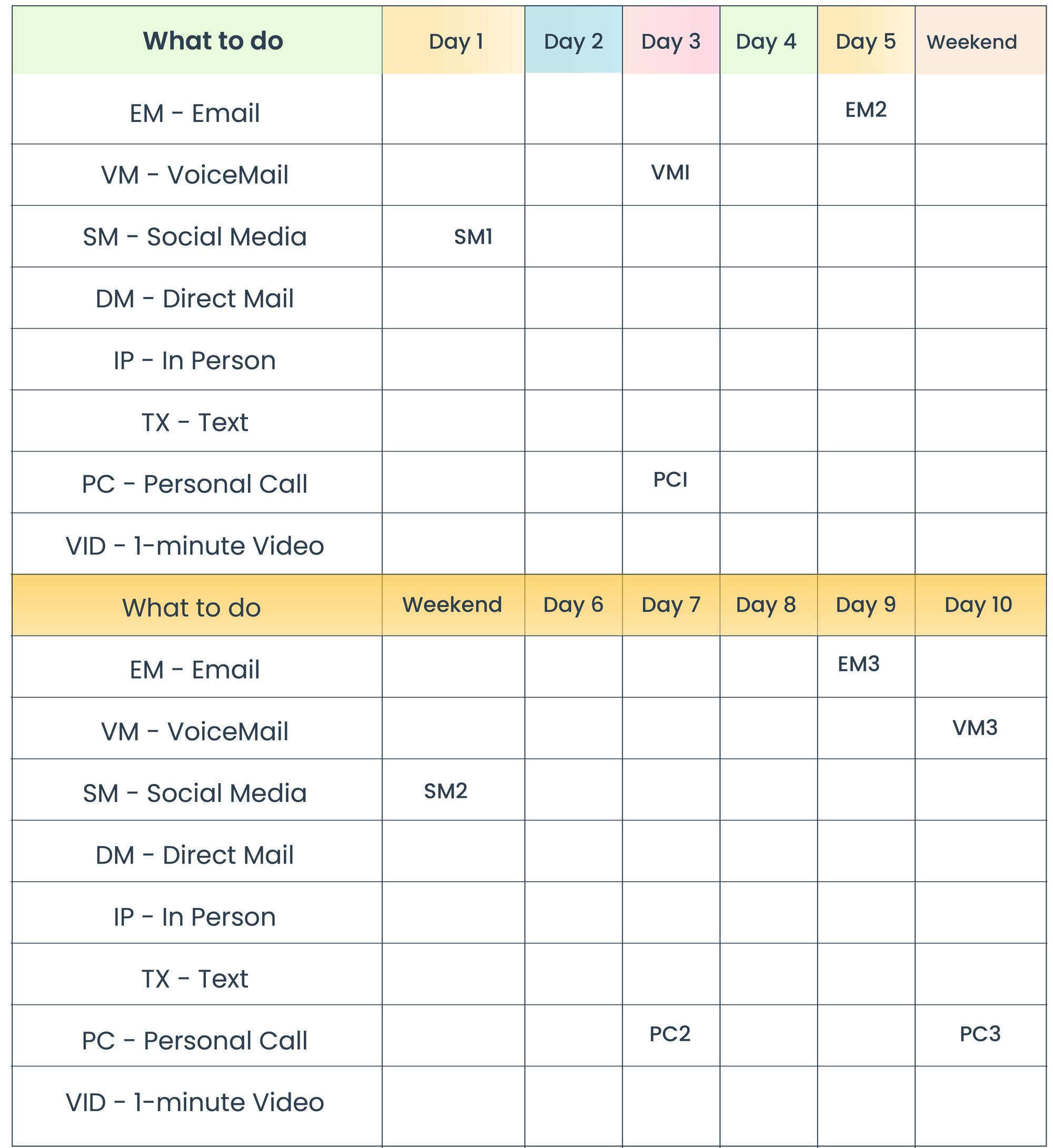 - Spacing - It seems like the accepted standard right now is a two to three-day spacing in between touches. If the touch gap is longer than that, you’ll lose attention. If the buyer's window is not open during your first two weeks, then, give it a rest.
