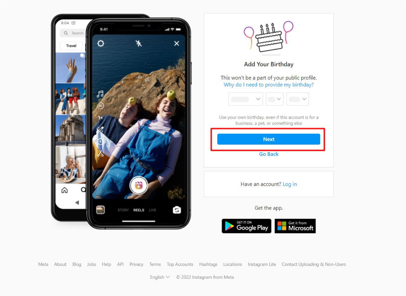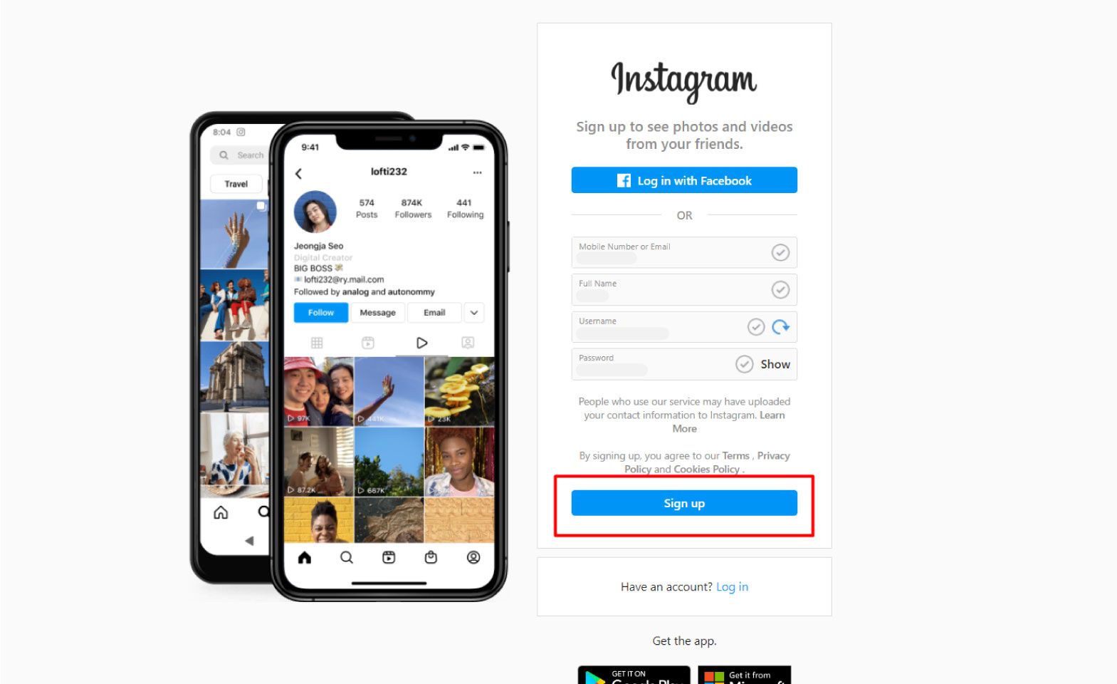 1. Sign up using the Instagram app, or go to instagram.com and click the Sign-up button on the main page.