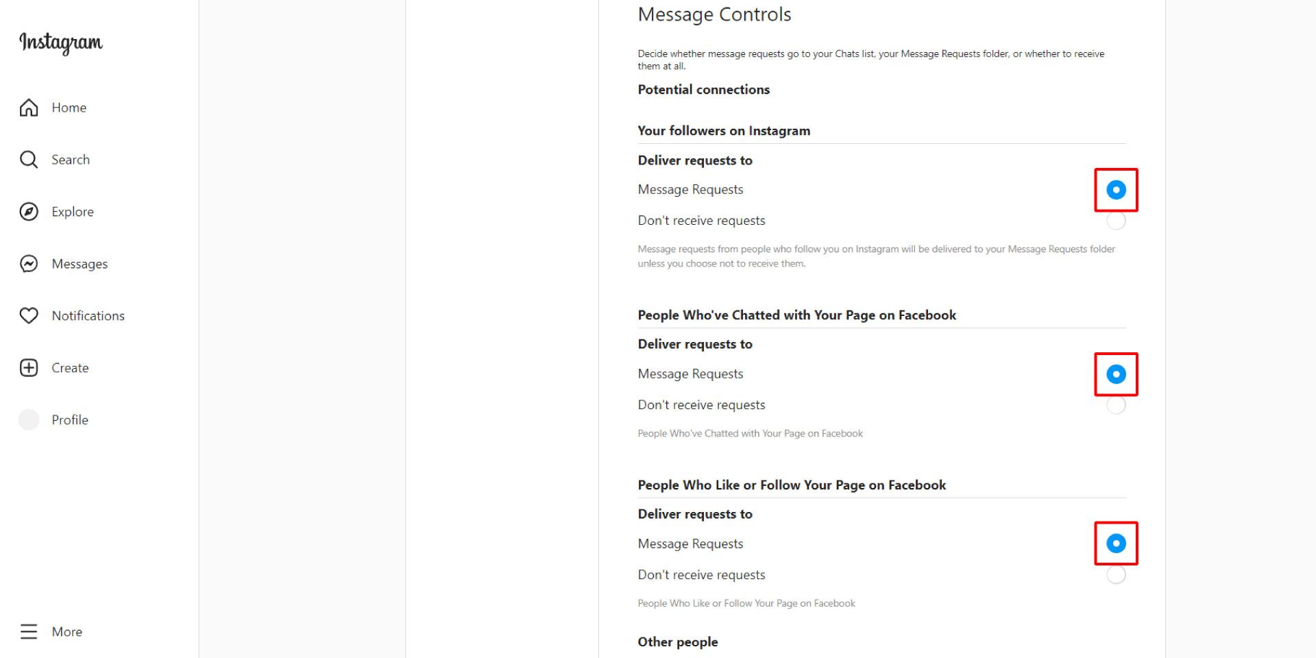 4. Scroll down to “Message controls”. Choose the “Message Requests” option for “Your followers on Instagram”, “People who have chatted with your page on Facebook”, and “People who like or follow your page on Facebook”