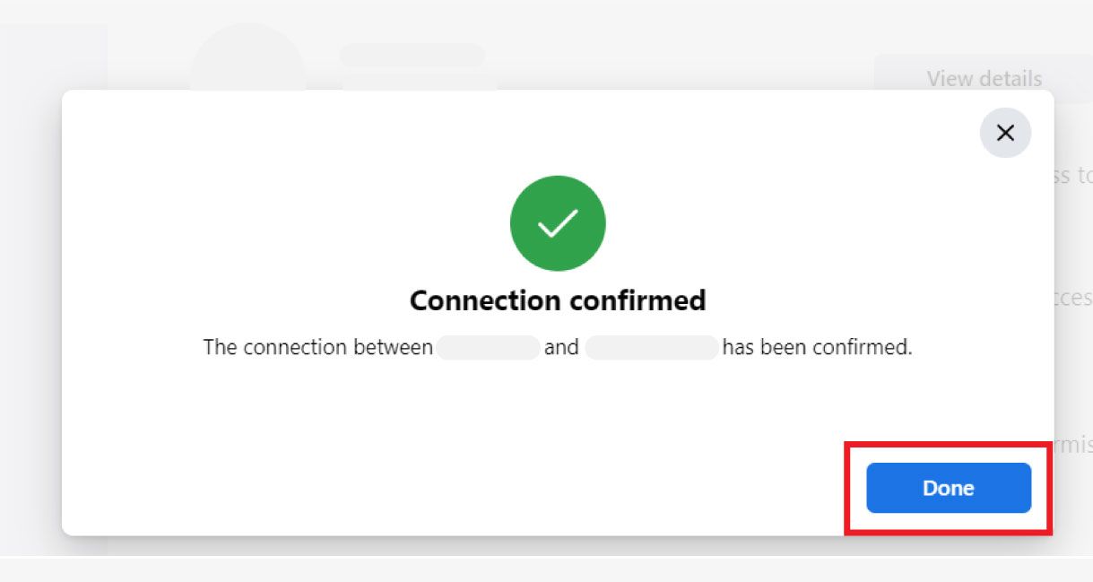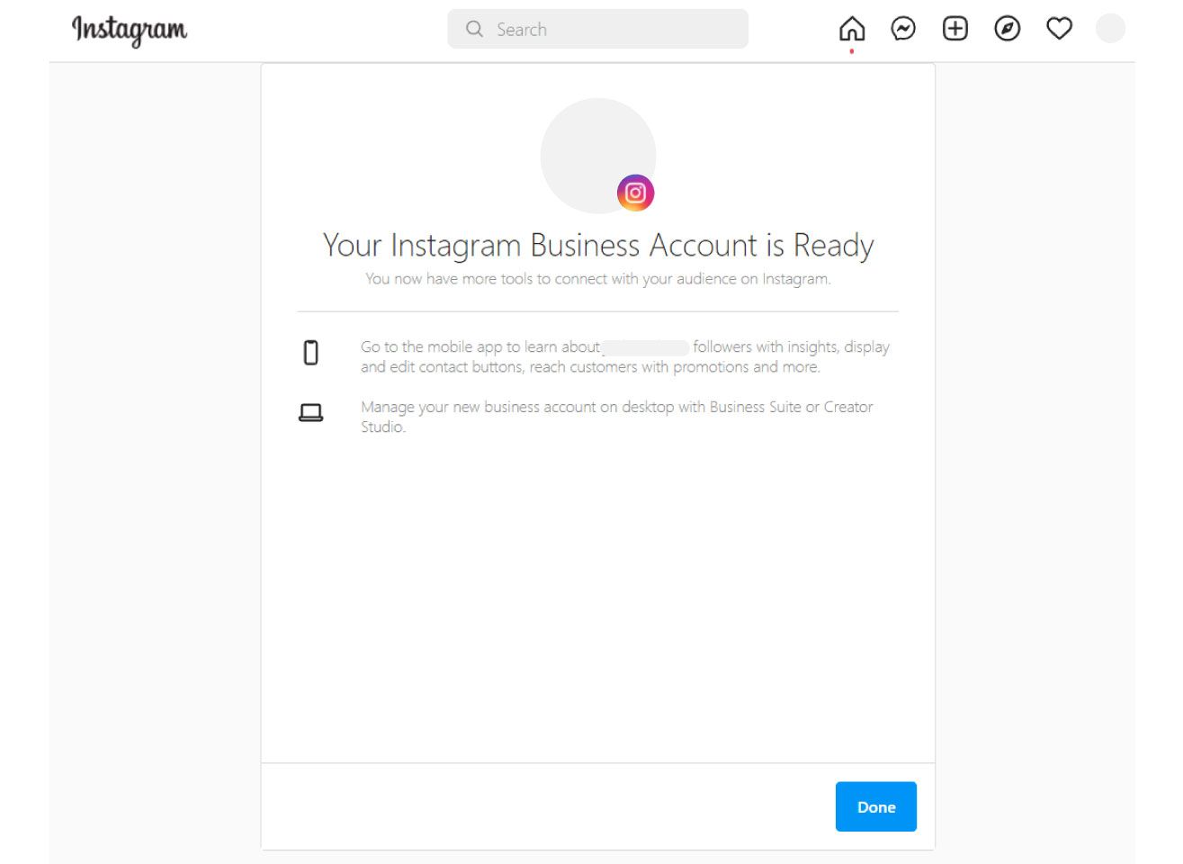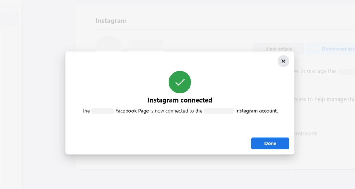 9. After you log in, the Instagram account will be connected to your Facebook business account. Click “Done”.