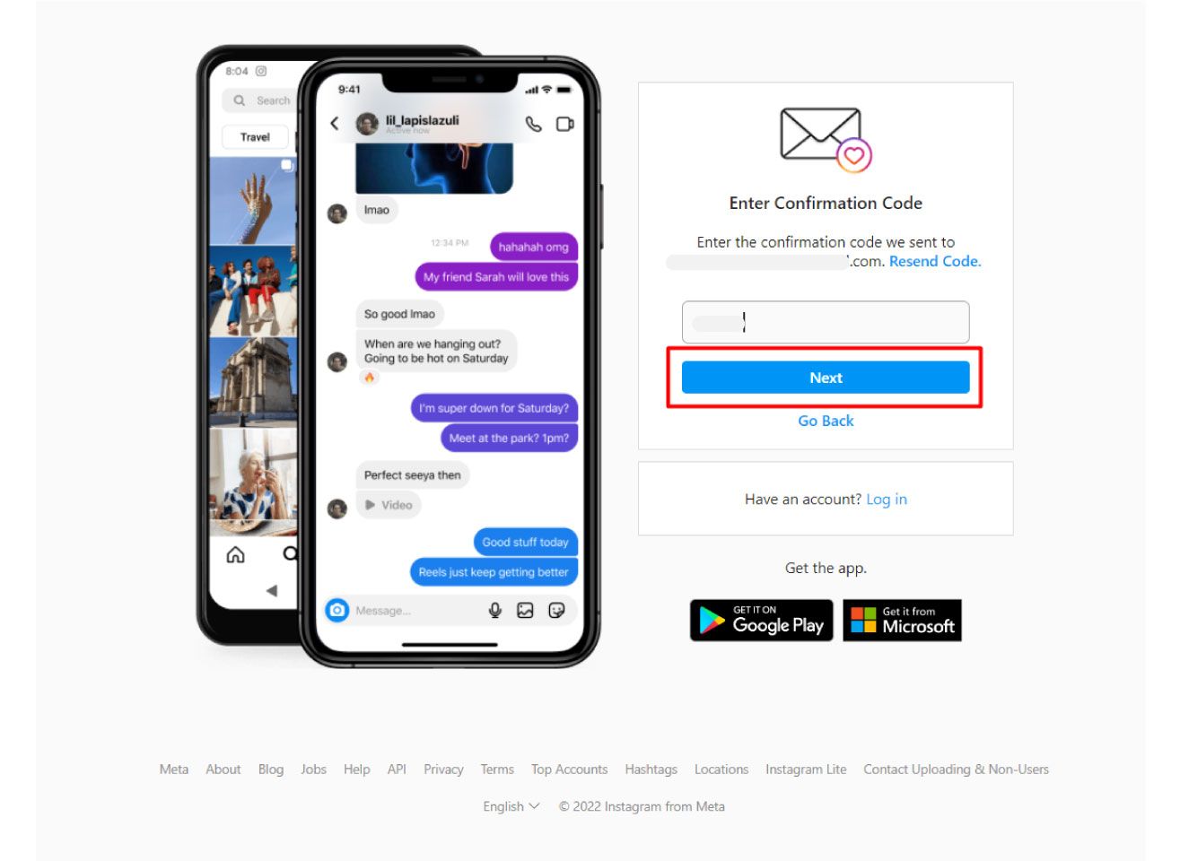 4. Enter the confirmation code that you have received on your registered email address or your mobile number (whichever you have entered in step 2) and click “Next”. You have now created an Instagram account.