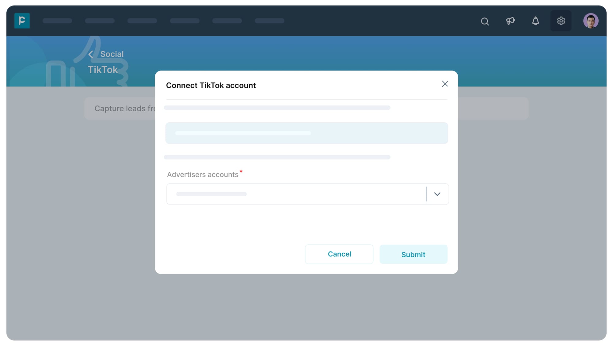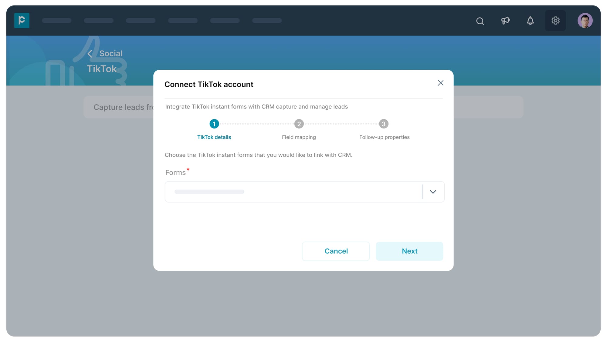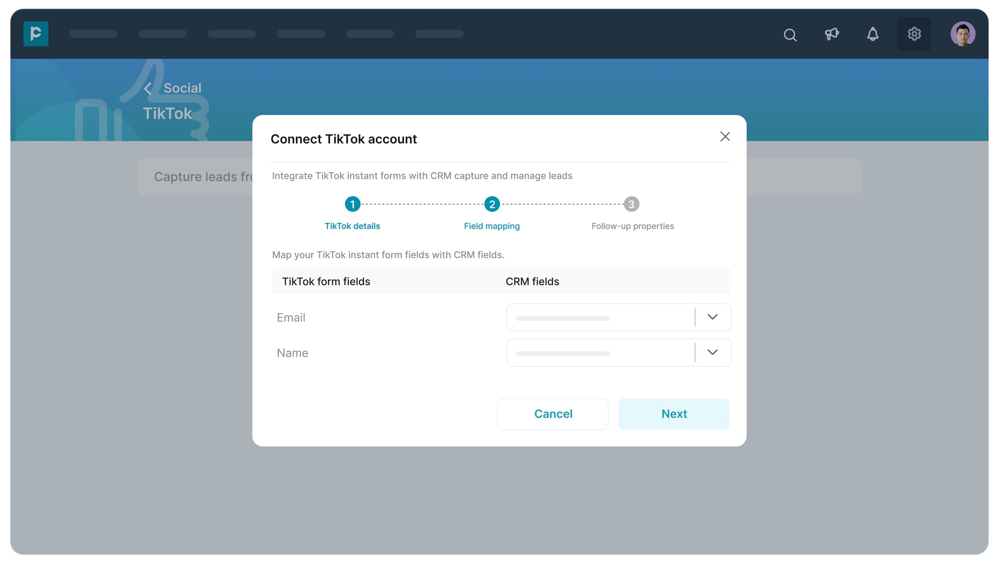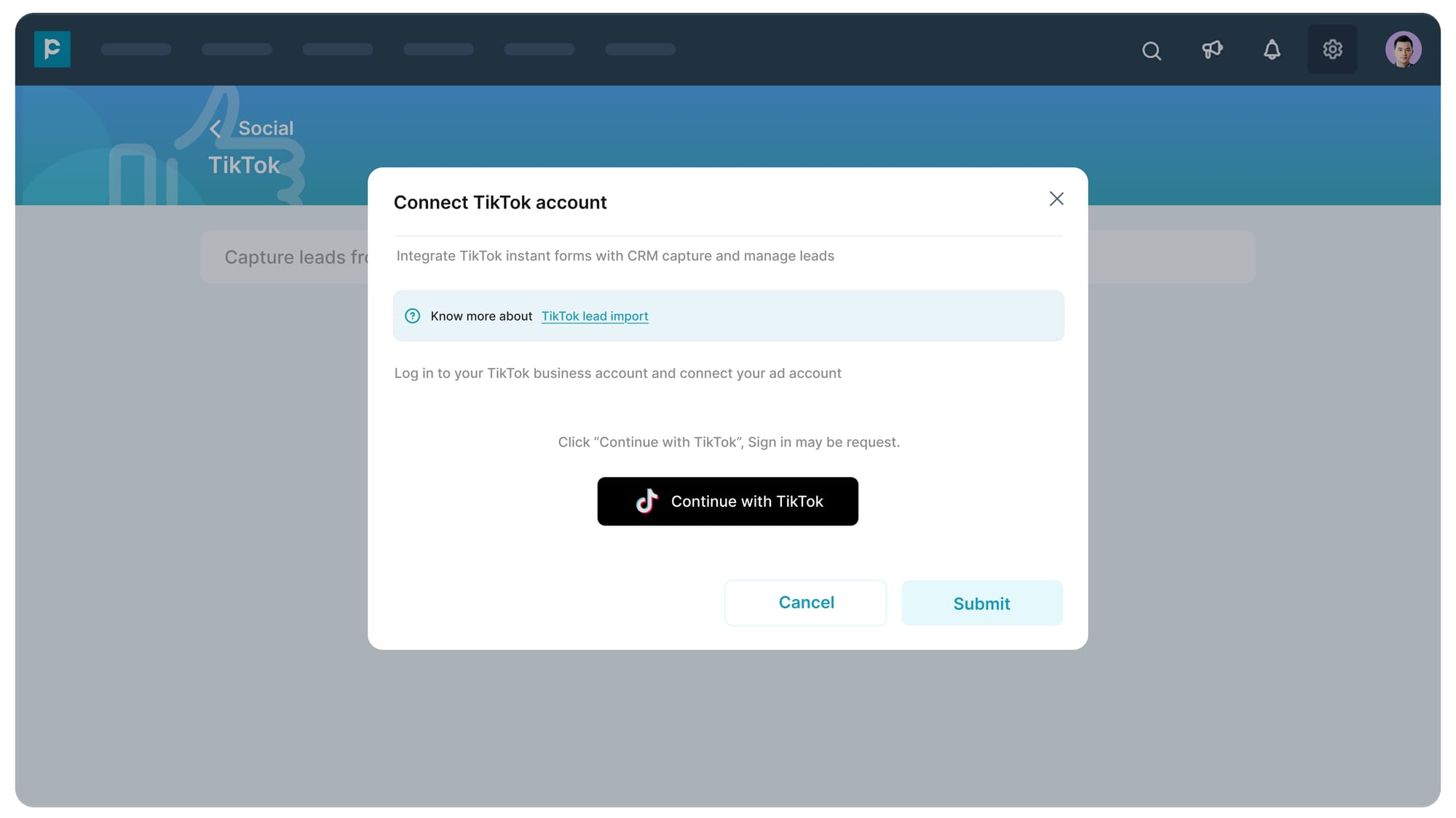 - Click on “TikTok” to integrate your TikTok account with CRM.