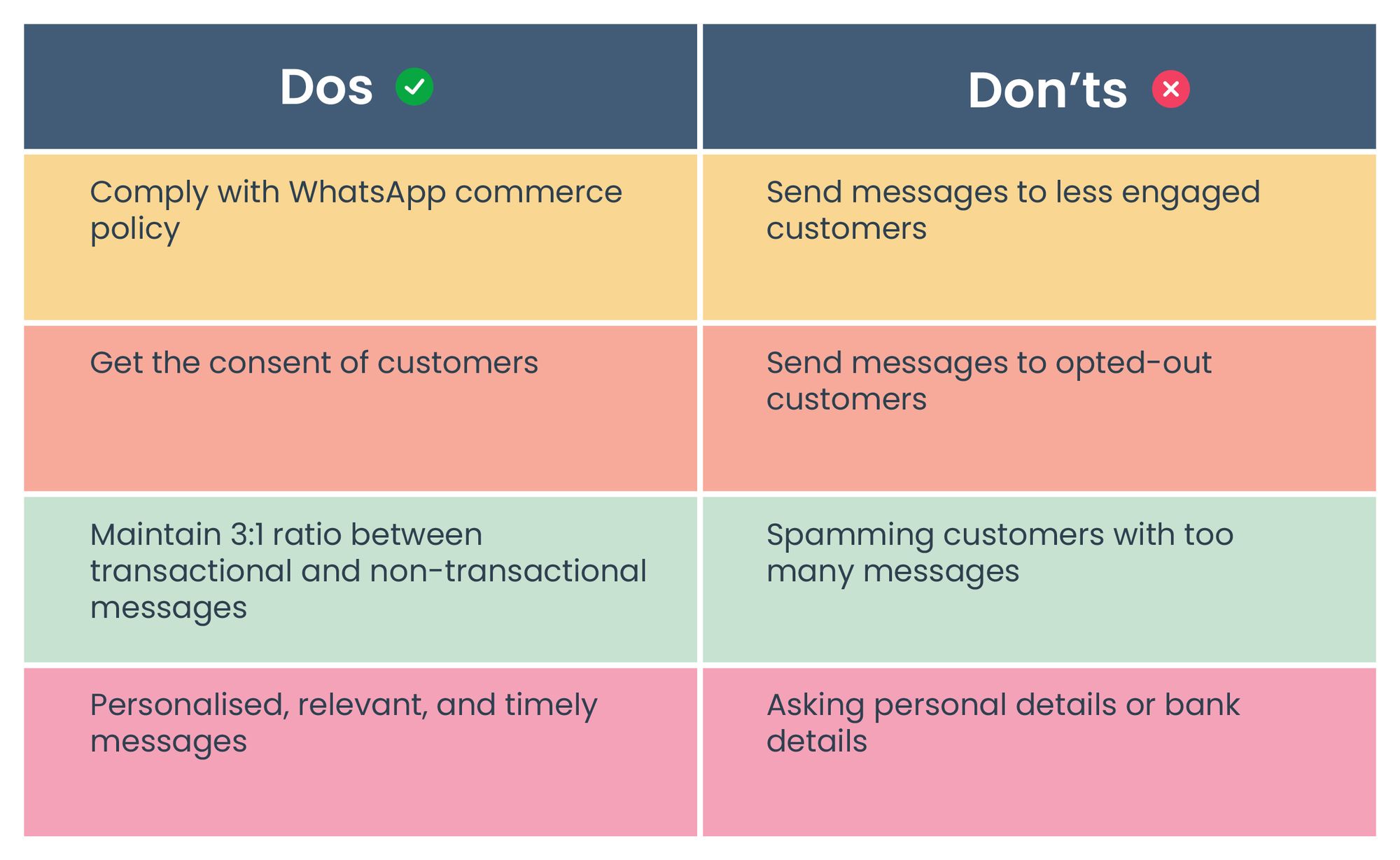WhatsApp has allowed you to promote your business on its platform. But at the same time, WhatsApp is customer-focused and wouldn’t appreciate it if businesses spam the customers. For the same reason, there are certain guidelines that businesses must follow while sending WhatsApp marketing messages.
