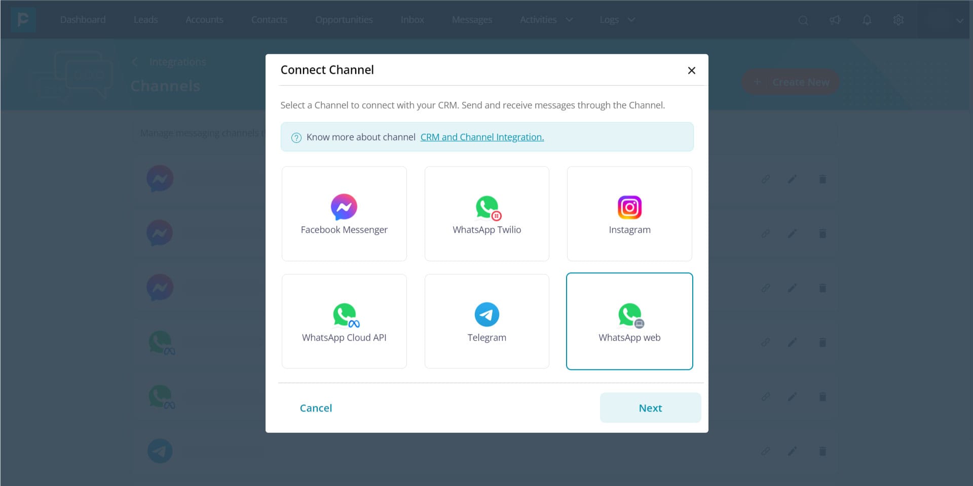 5. In the popup that opens, choose the “WhatsApp Web” channel and click “Next”