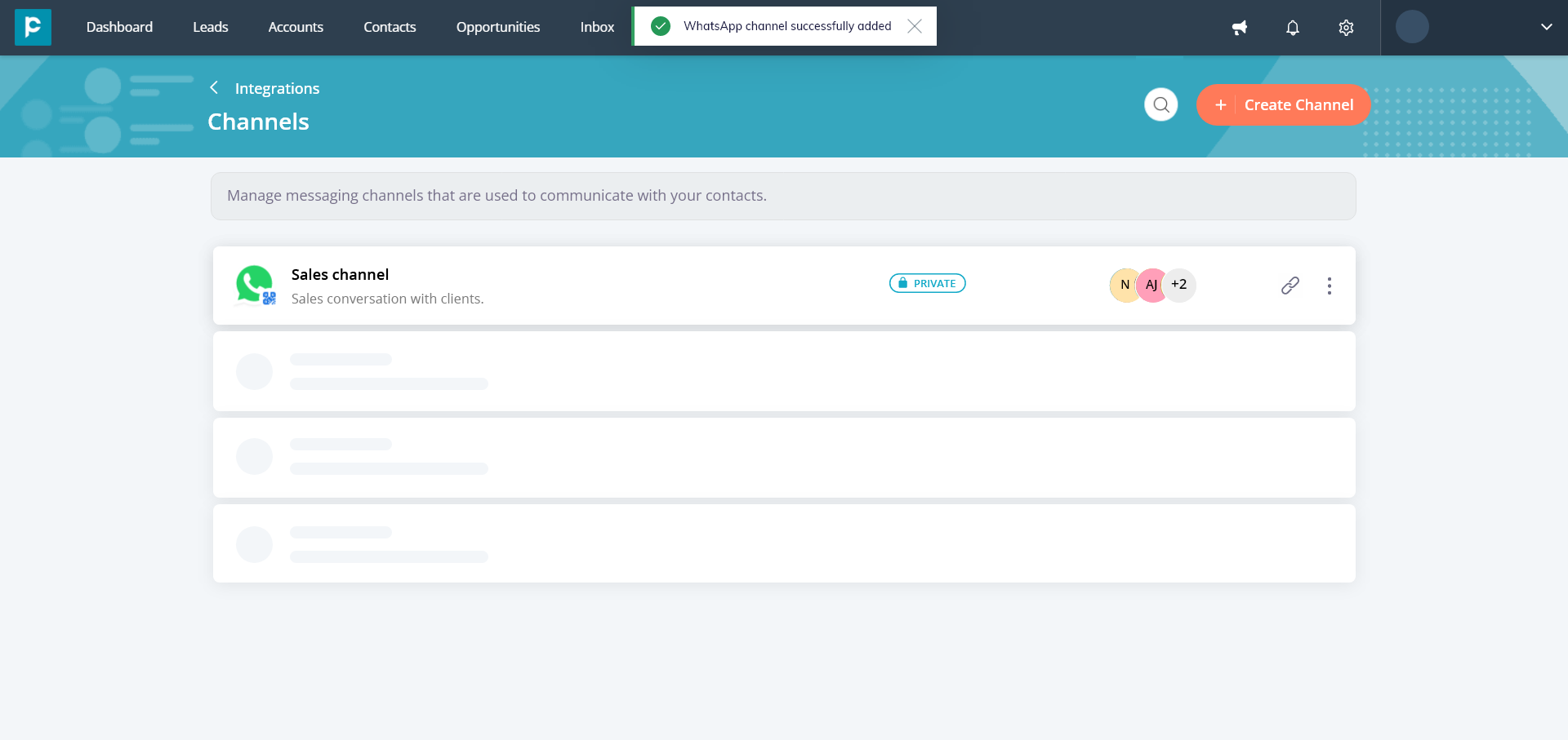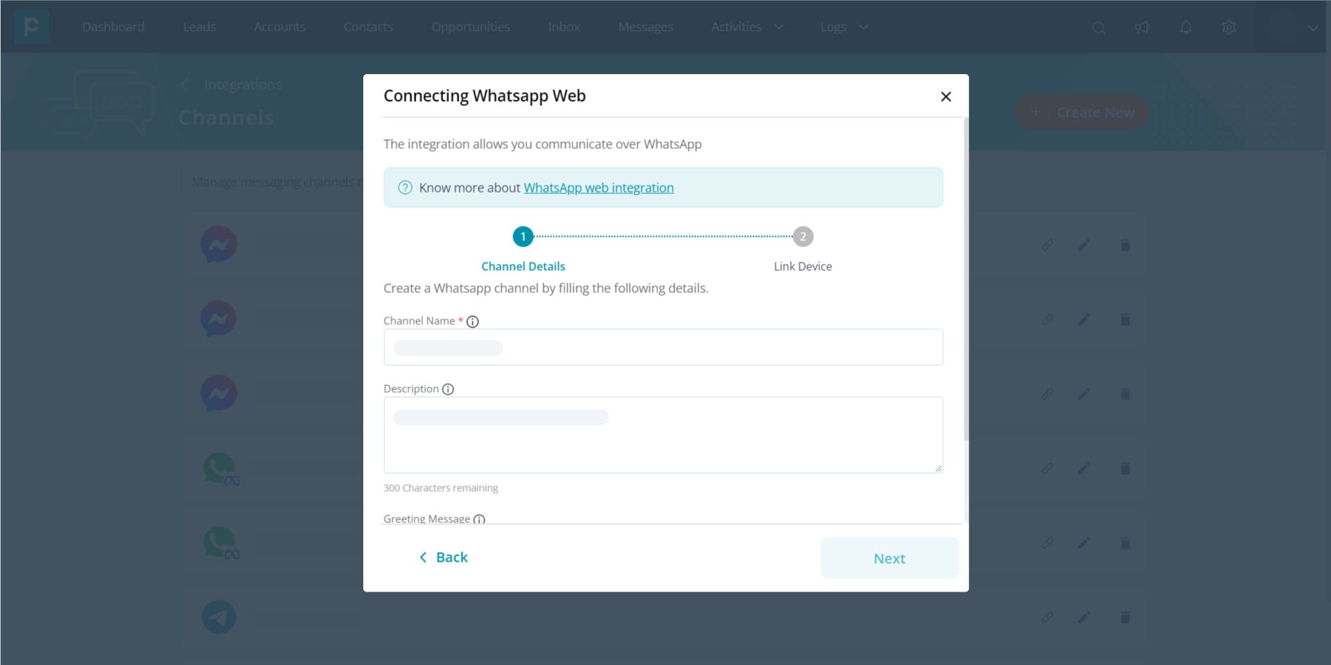 - Setup greeting message: When you create a channel for WhatsApp Web in your CRM, you can create and set up a greeting message for your prospects and customers.